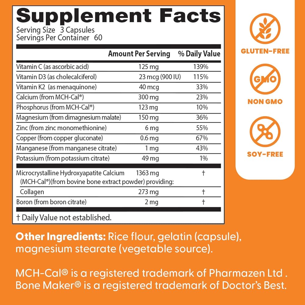 Bone Health Requires Multiple Nutrient InputsThe popular literature would have us believe that by taking calcium supplements we can keep our bones strong into old age. But the medical literature tells a different story: calcium taken by itself does not reliably conserve bone mineral density or reduce risk of bone fractures. Rather, the clinical research indicates bone integrity is better conserved by supplementing with other minerals and nutrients in addition to calcium.Calcium Mineralization Of Bone Requires A Preformed Matrix.Fully formed bone is a connective tissue matrix infiltrated with microscopic calcium hydroxyapatite crystals that confer bulking and considerable mechanical strength. The process of calcium deposition can occur only where a bone matrix is in place to “ accept” it. Bone matrix is analogous to a grid of steel bars over which concrete is poured— without these “ rebars” the poured concrete will be flawed and vulnerable to fracturing under mechanical strain. The bone matrix structure is primarily a web of large, fibrous collagen molecules, interspersed with smaller amounts of other proteins and glycosaminoglycans (protein-carbohydrate complexes). Calcium Bone Maker Complex supplies a very similarly composed, semi-assembled collagen web, in the form of ossein microcrystalline hydroxyapatite complex. This organically prepared bone extract includes collagen and the other bone matrix proteins, along with bone growth factors (small proteins that enhance bone growth and renewal), highly bioavailable calcium, and other mineral building blocks for the bone matrix.