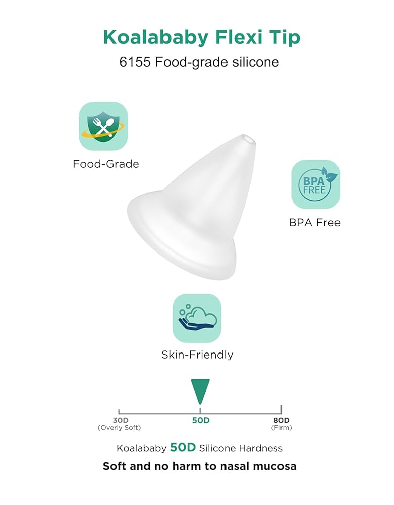 Soft & Gentle: We care about your baby's comfort. Our infant nasal aspirator uses BPA-free, food-grade soft silicone tips that flex for tiny nostrils and feel gentle during cleaning. The comfortable fit helps baby cooperate, making this baby nose cleaner easy to place and remove for safe, comfortable cleaning in daily care