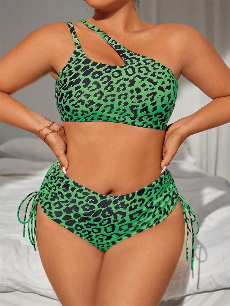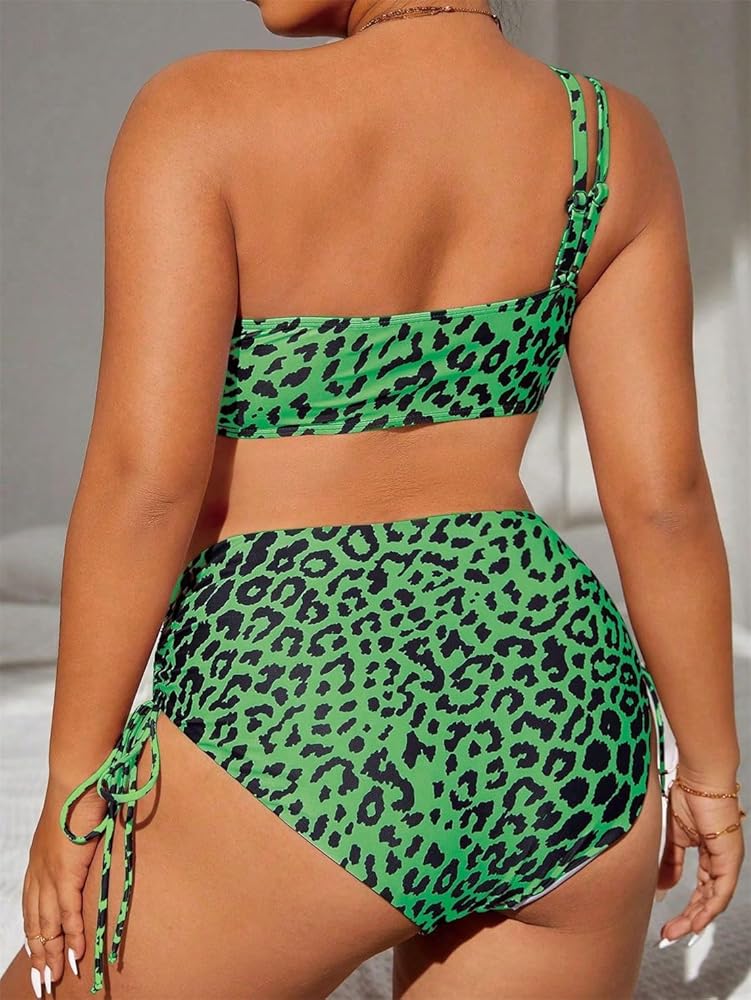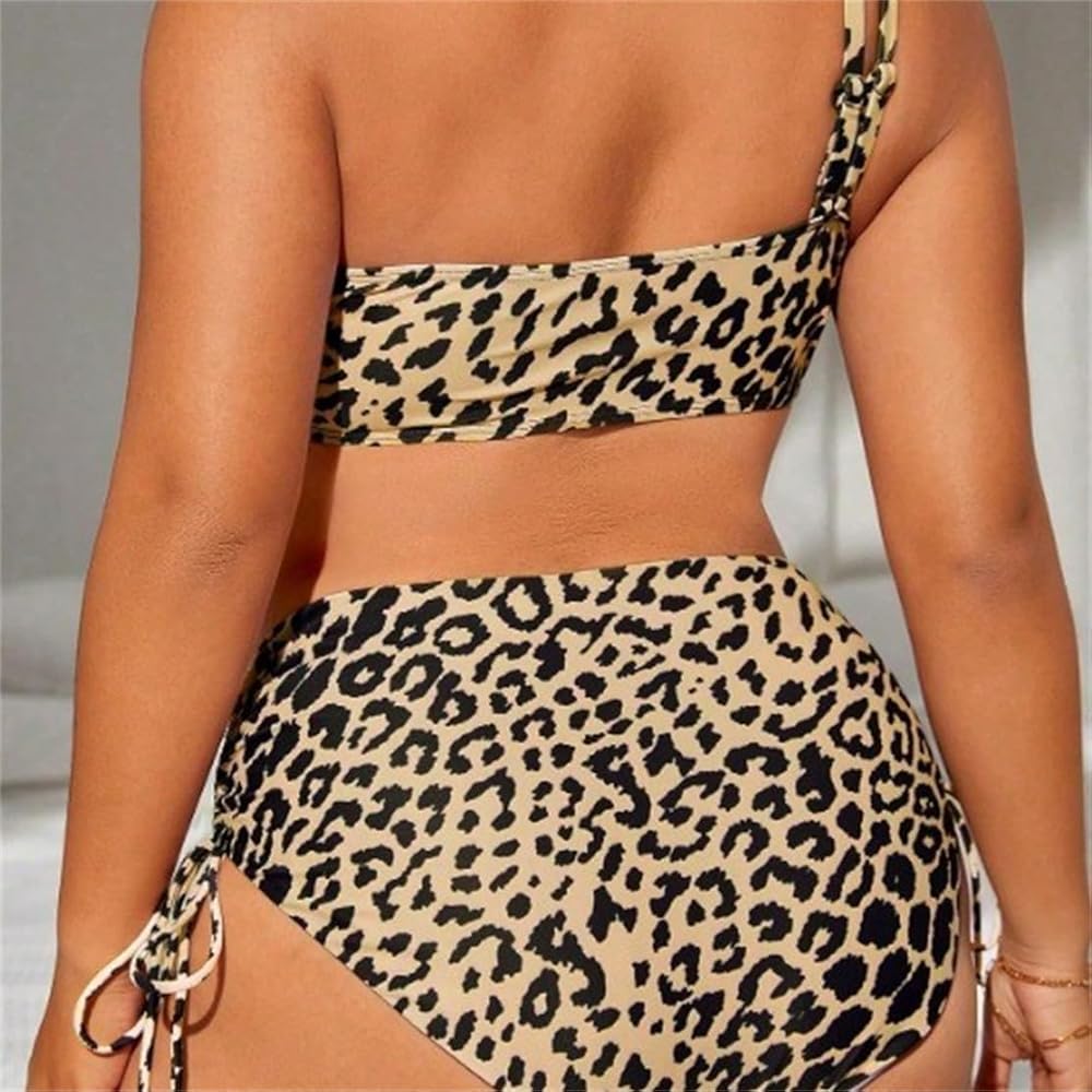 Make a bold statement at the beach or pool with this striking leopard print Plus Size two-piece bikini set. The asymmetrical top features a unique one-shoulder design that offers stylish support, while the high-waisted bottom includes fashionable side ties that allow for adjustable fit and coverage. The classic animal pattern in neutral tan and black tones creates a wild yet sophisticated look that flatters curves beautifully. This Oversize swimsuit combines contemporary style with practical comfort, making it perfect for swimming, sunbathing, or beach activities. The high-waist design provides tummy control while maintaining a flattering silhouette. The durable fabric maintains its shape and pattern vibrancy even after multiple uses. Available in plus sizes, this swimwear set is designed to embrace and enhance your natural curves while providing the confidence you deserve for your beach or poolside adventures.