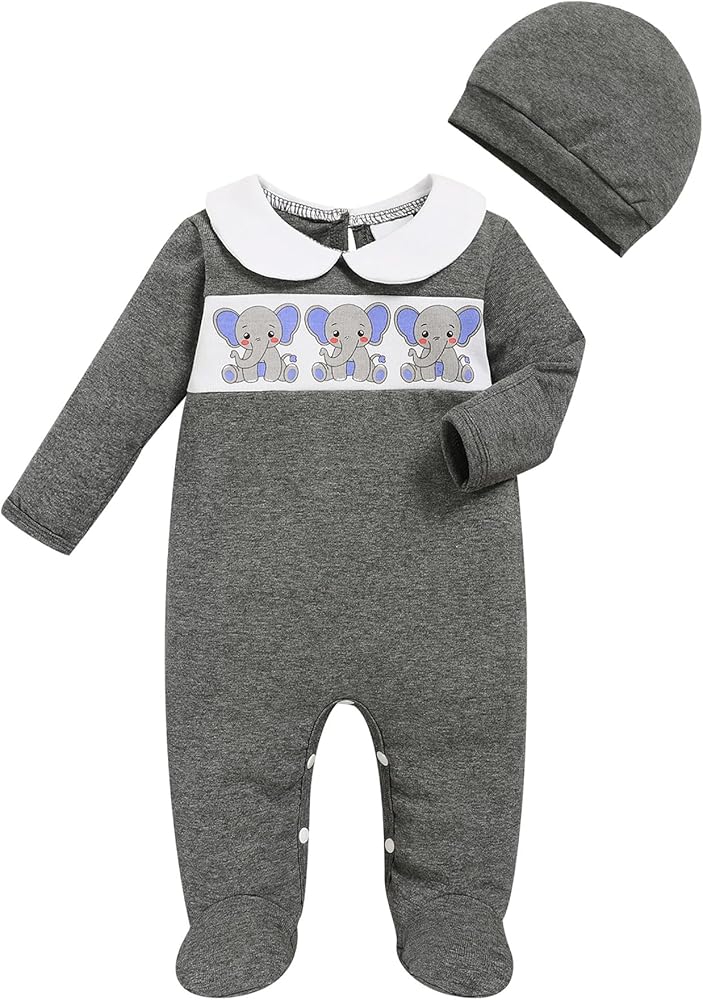 👼【UNIQUE DESIGNS】Newborn Baby Boy outfit jumpsuit with hat. Cotton Version Cartoon printed Long sleeve romper. Snap diaper closure covered button, easy to wear. Hat protects baby's head. More adorable, and your little one will also get lots of compliments on it