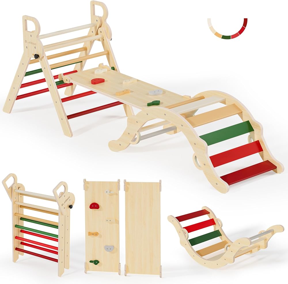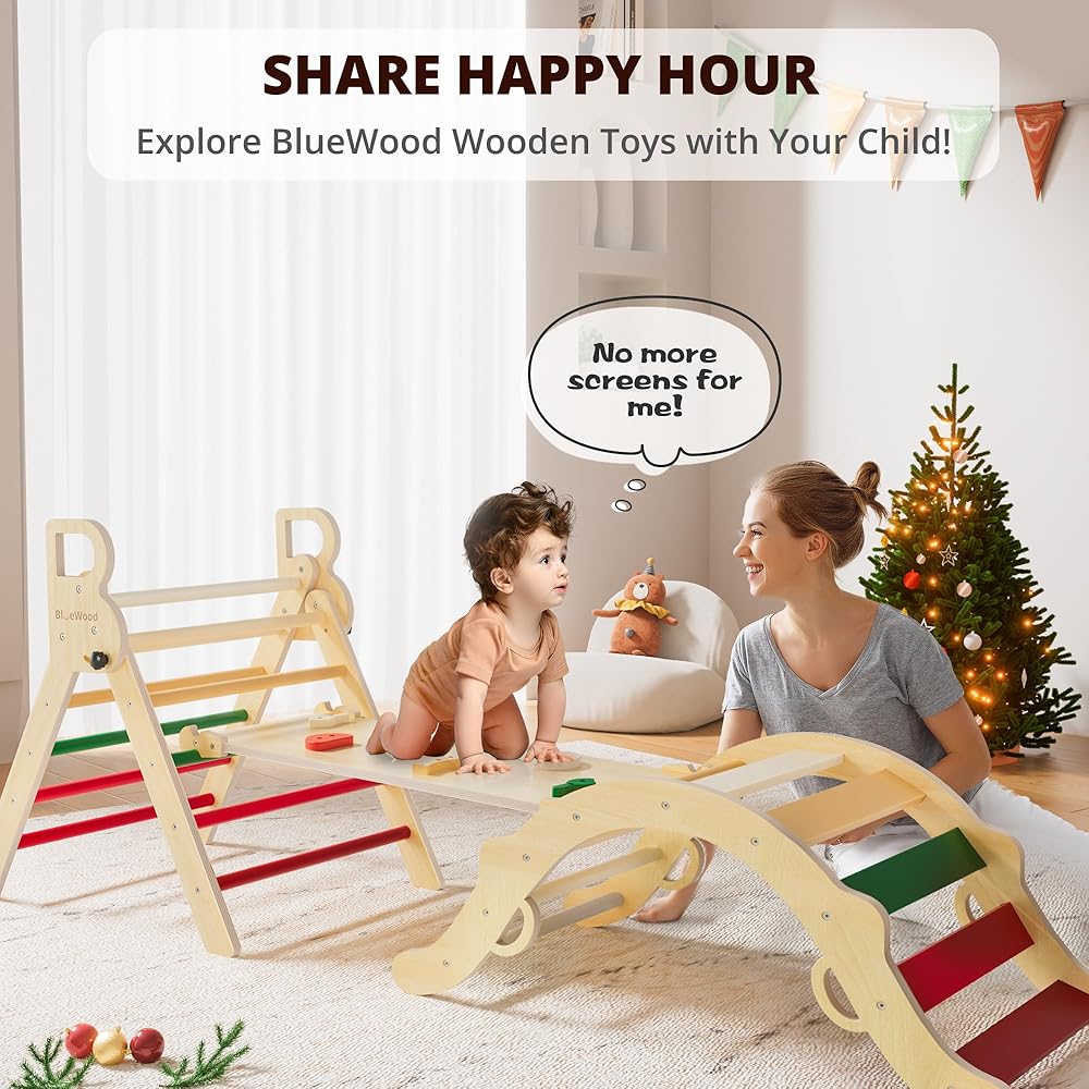 Immersive Wood Climber: Unlike electronic and optical toys, the upgraded Pikler Triangle Set features a unique natural wood design with triangles, slides, and arches, and at least seven different modes of play, providing more diverse play choices