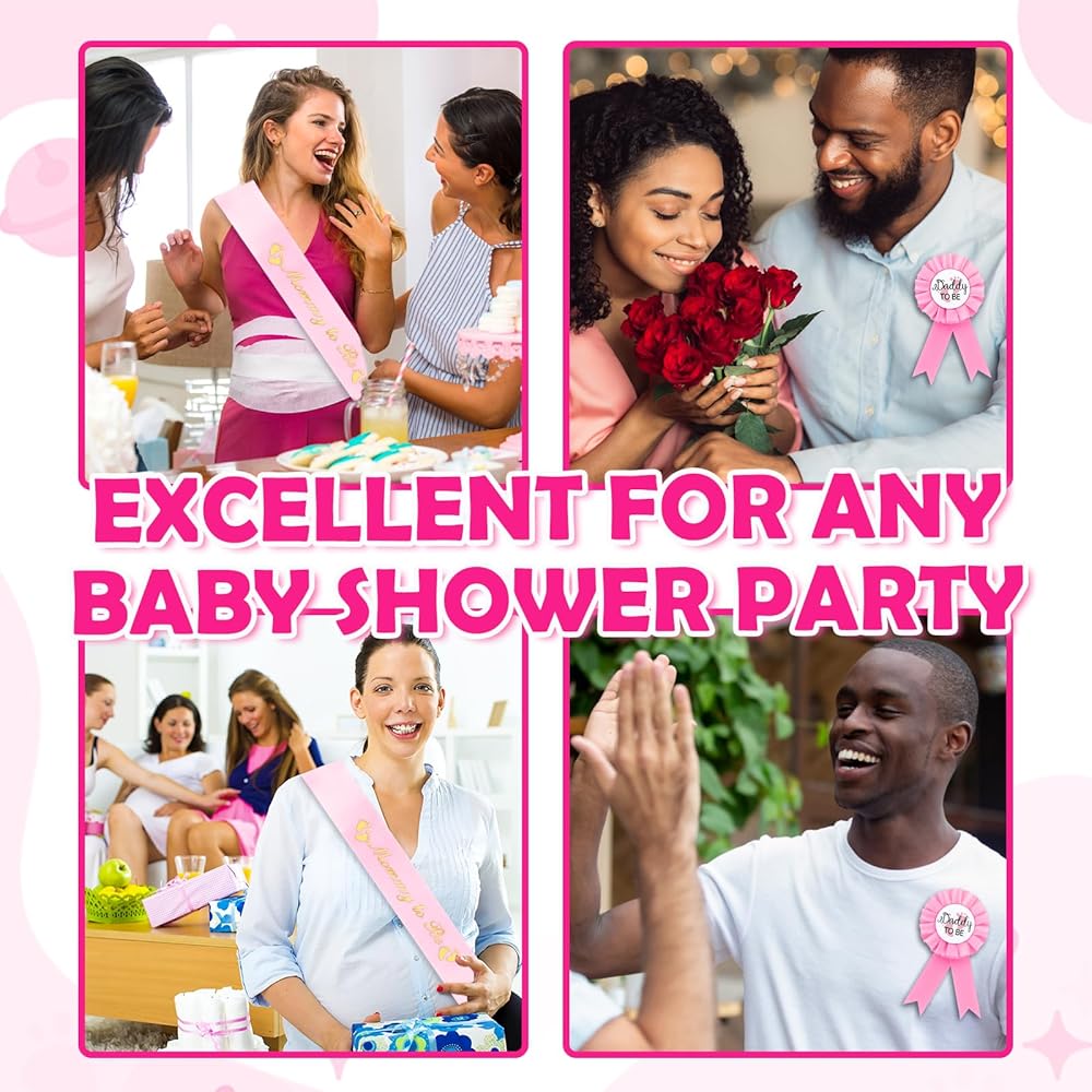 Elevate your gender reveal or shower with this charming pink-themed duo! The shower decorations for girl set includes a 31-inch glittering "Mom to Be" sash adorned with gold foil letters and a matching "Daddy to Be" badge featuring delicate pink footprints on a ribbon. Suitable for photo sessions, the sash's adjustable fit (7.67" wide) flatters all body types, while the badge pins effortlessly to shirts, letting proud parents-to-be shine. Crafted with soft, shiny materials and whimsical details, this set creates a dreamy, joyful atmosphere for girl-themed celebrations. Ideal as a heartfelt gift for expecting friends or a keepsake to treasure milestones, it blends functionality with sentimental style—turning ordinary moments into unforgettable memories