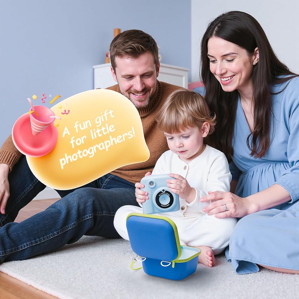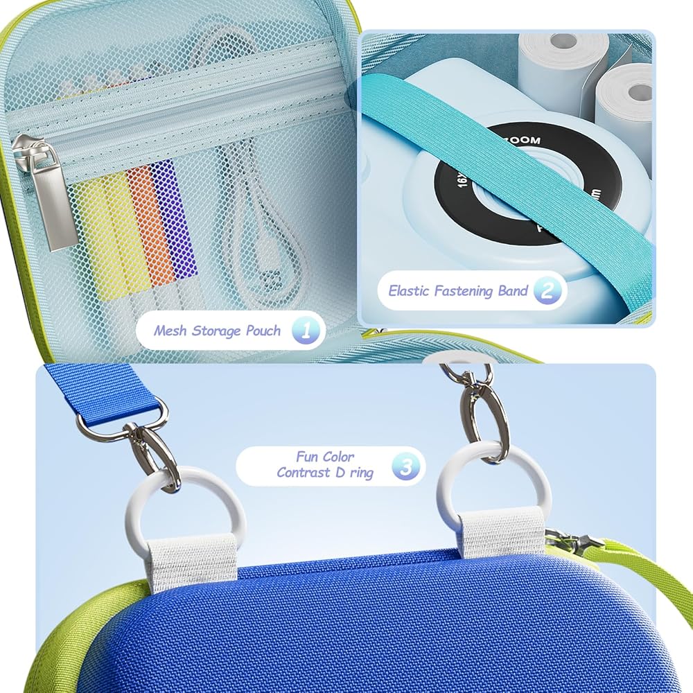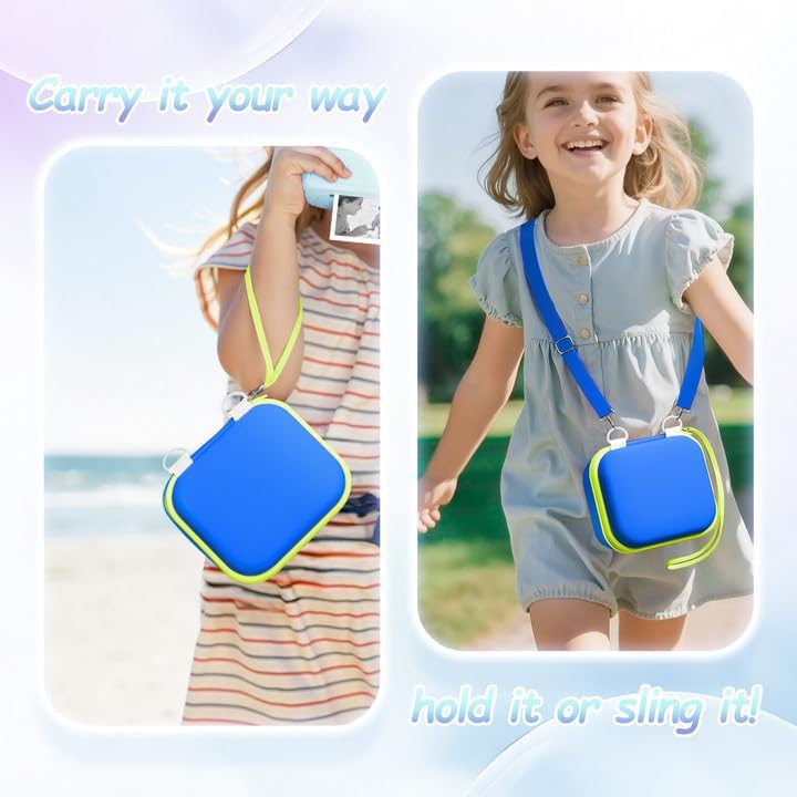 This colorful hard carrying case is designed to protect and organize kids' instant print cameras and accessories—perfect for play, travel, or gifting!