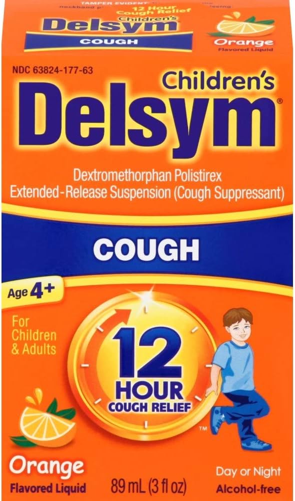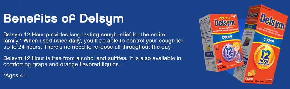 Delsym Children's Cough Suppressant Liquid for Children is a 12 Hour cough suppressant providing cough relief in Grape and Orange flavors that has a patented time-release medicine that goes to work fast to silence cough for a full 12 hours – up to 2 times longer than other cough liquids*. *Among OTC liquids per dose. Contains Dextromethorphan Polistirex Extended-Release Suspension (Cough Suppressant) for Children and Adults. Alcohol-Free medicine.