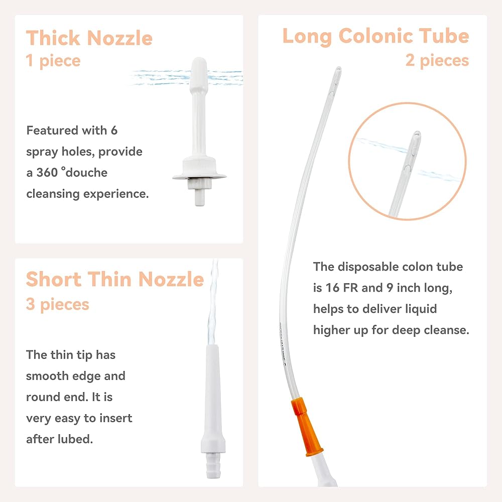 🌿[ 3.9 FT Hose With 6 Nozzles ] -- This home enema bucket kit comes with one 3.9FT silicone tube and six replacement tips. 1pc thick nozzle has 6 spray holes for better. 3pc short nozzles are easy to use, bring you a traditional experience. 2pc long colonic tubes can send warm water deep into your intestines for deep cleansing.