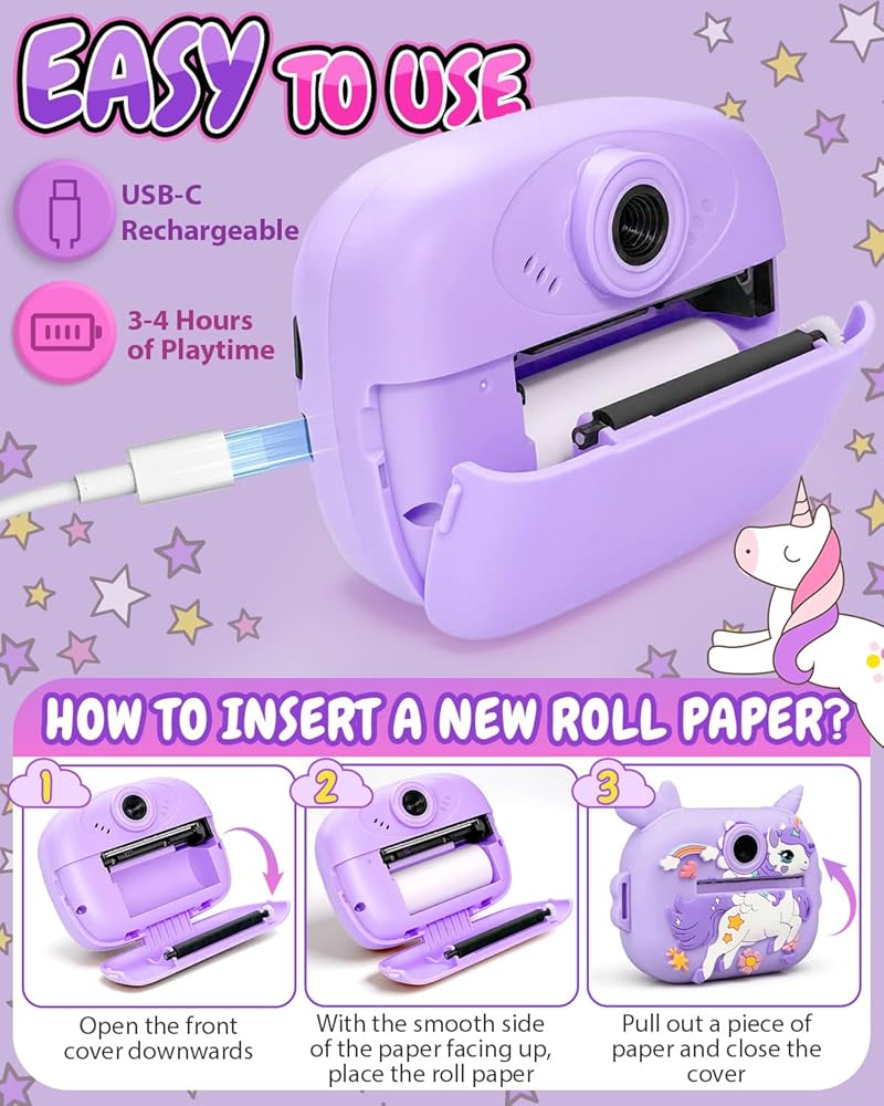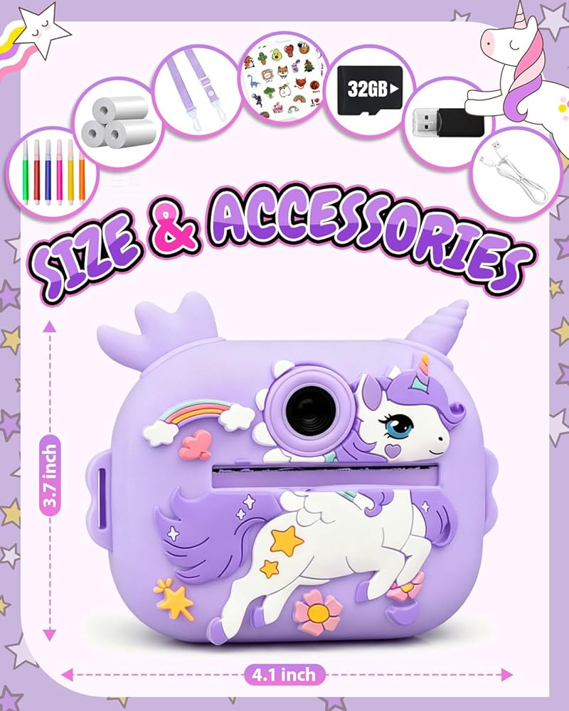 Instant Print Camera for Kids: This kids' instant print camera uses safe, non-toxic materials and ink-free thermal printing technology to deliver black-and-white photos in seconds. It comes with colored pens for added DIY fun, and color photos are automatically saved to an SD card for later digital viewing.