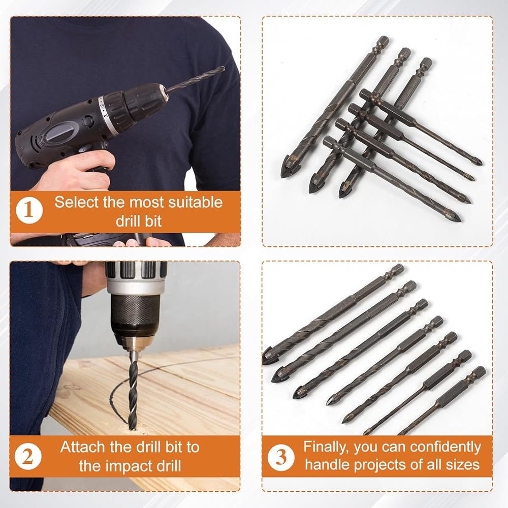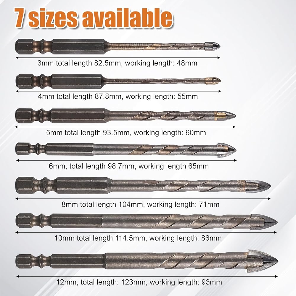 7-Piece Professional Eccentric Drill Bit Set: This comprehensive kit includes seven industrial-grade carbide bits (3mm, 4mm, 5mm, 6mm, 8mm, 10mm, 12mm) with universal hex shanks. The precisely calibrated sizing ensures perfect holes in various materials.
