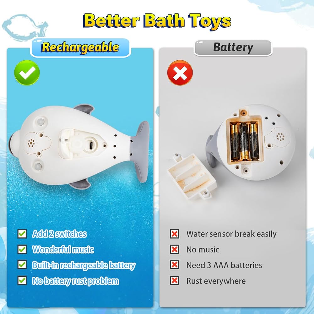 Rechargeable Dolphin Bath Toys: Our dolphin spray water infant bath toys built in a 1500 mAh rechargeable battery, each full power can support more than 2 hours bath play time. No need extra batteries. Save your money