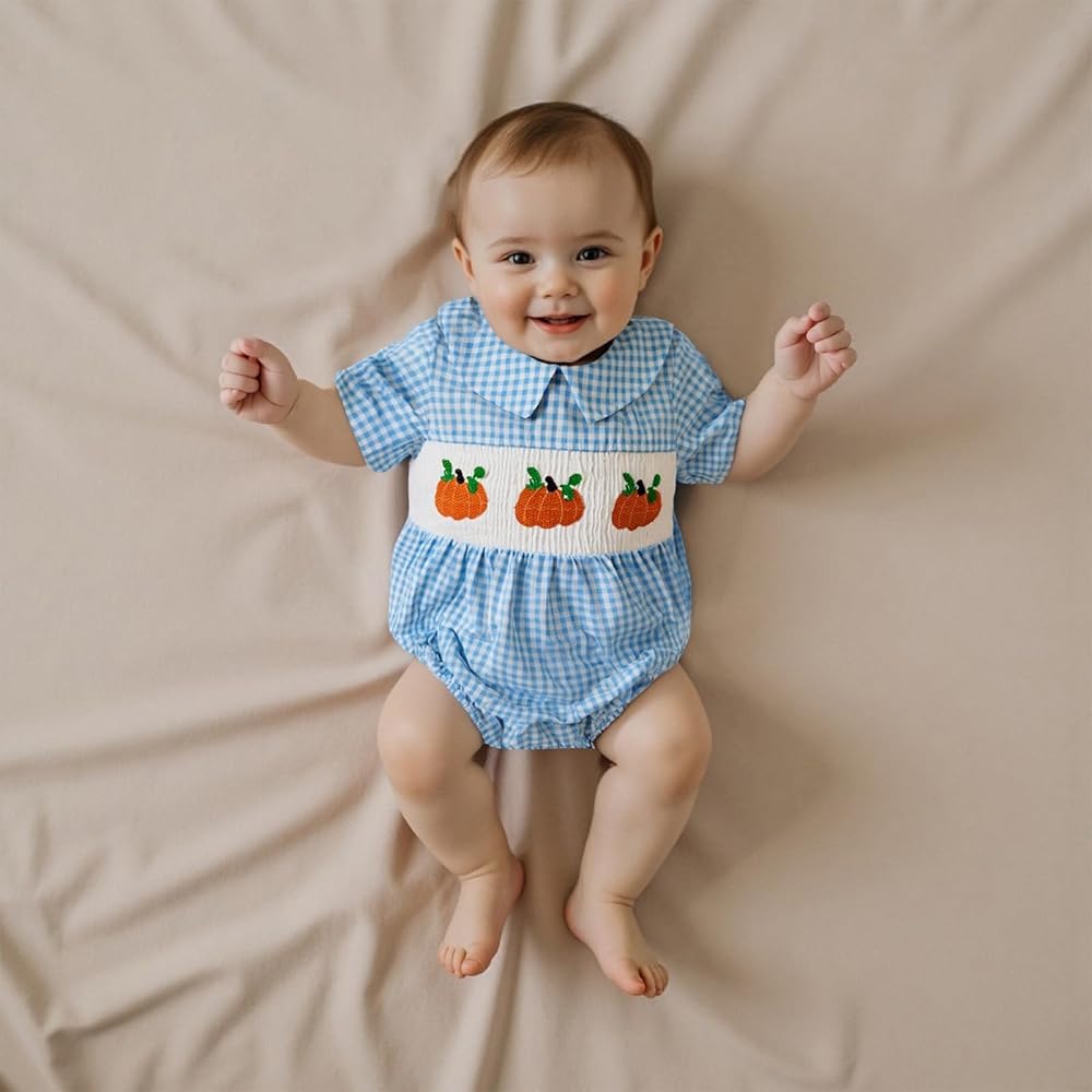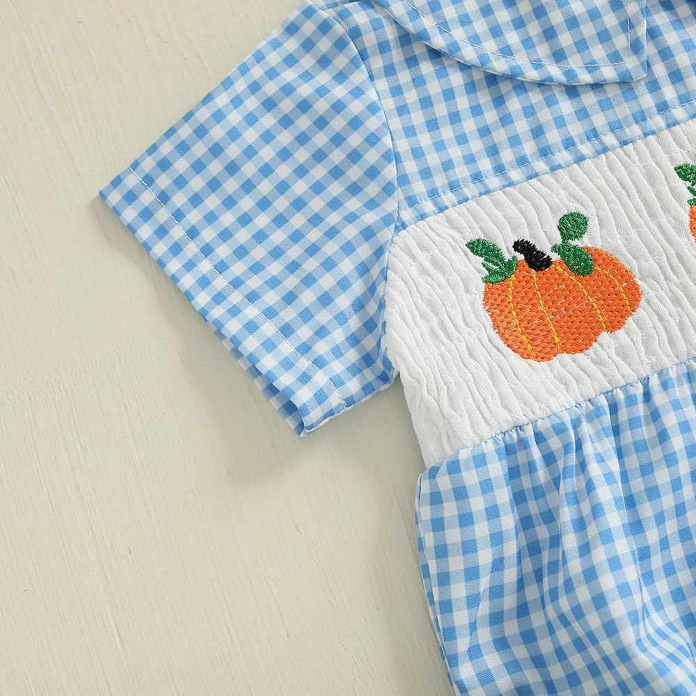 Infant Boy Smocked Pumpkin Romper Embroidery Babydoll Collar Short Sleeve Gingham Bodysuit Baby Halloween Clothes