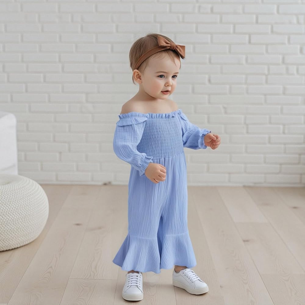 Emmababy Linen Smocked Romper Toddler Bell Bottom Jumpsuit Baby Girl Flare Overalls Solid Long Sleeve Off Shoulder Romper