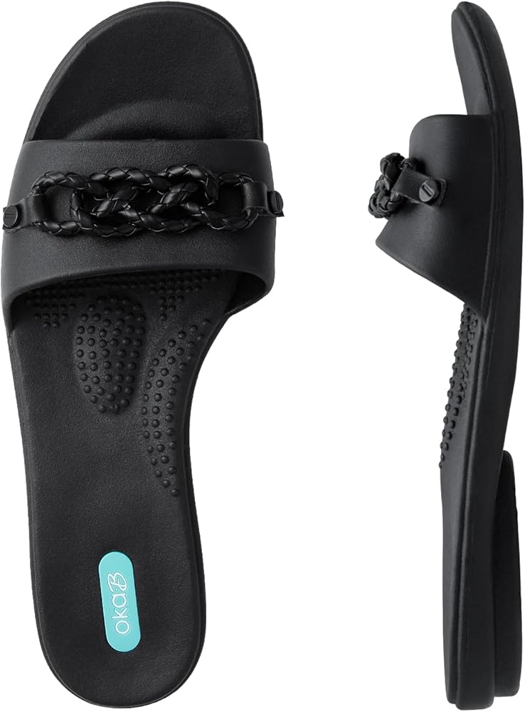 Meet Cici. Oka-B's spa slide with a fishtail braid charm! Waterproof, arch-support sandals in navy & black. Made from recycled materials in USA.