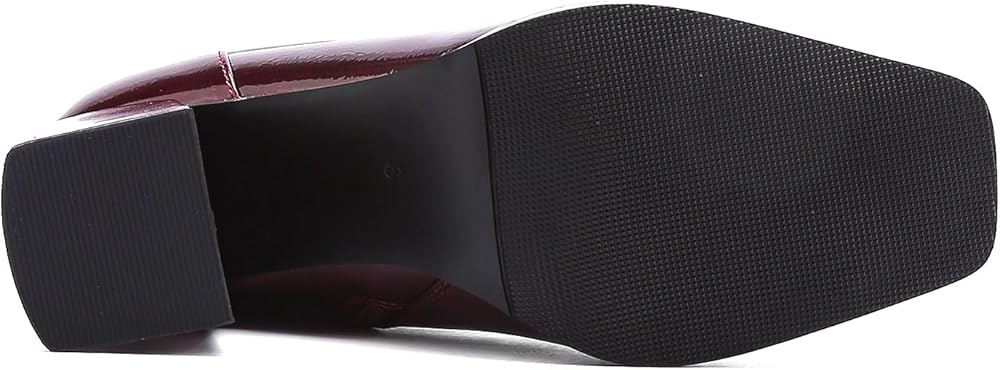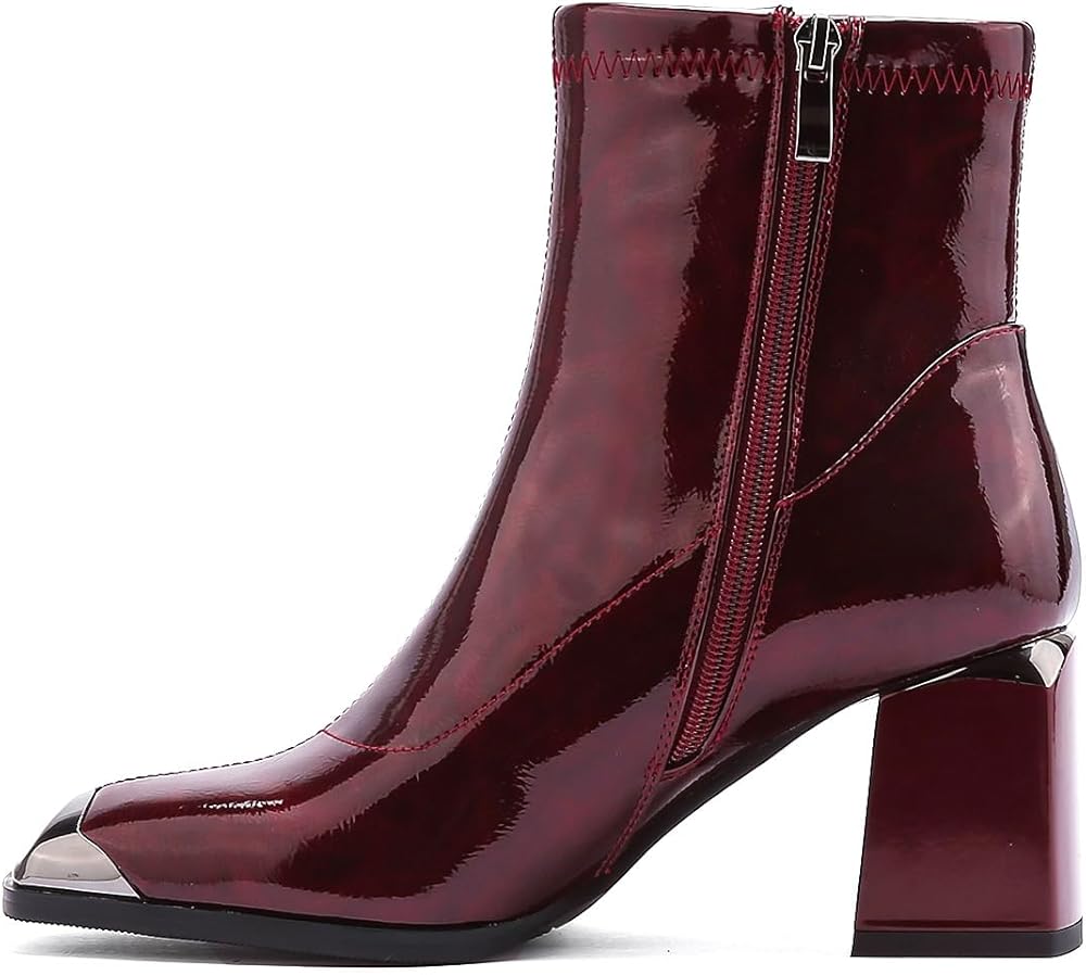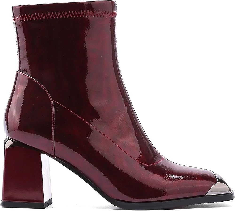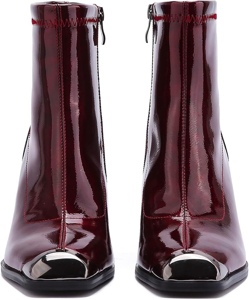 This sleek patent bootie has metal detail on the toe and 2.5" block heel. Easy fit with a full inside zipper and soft insole padding and rubber outsole for comfort and grip.