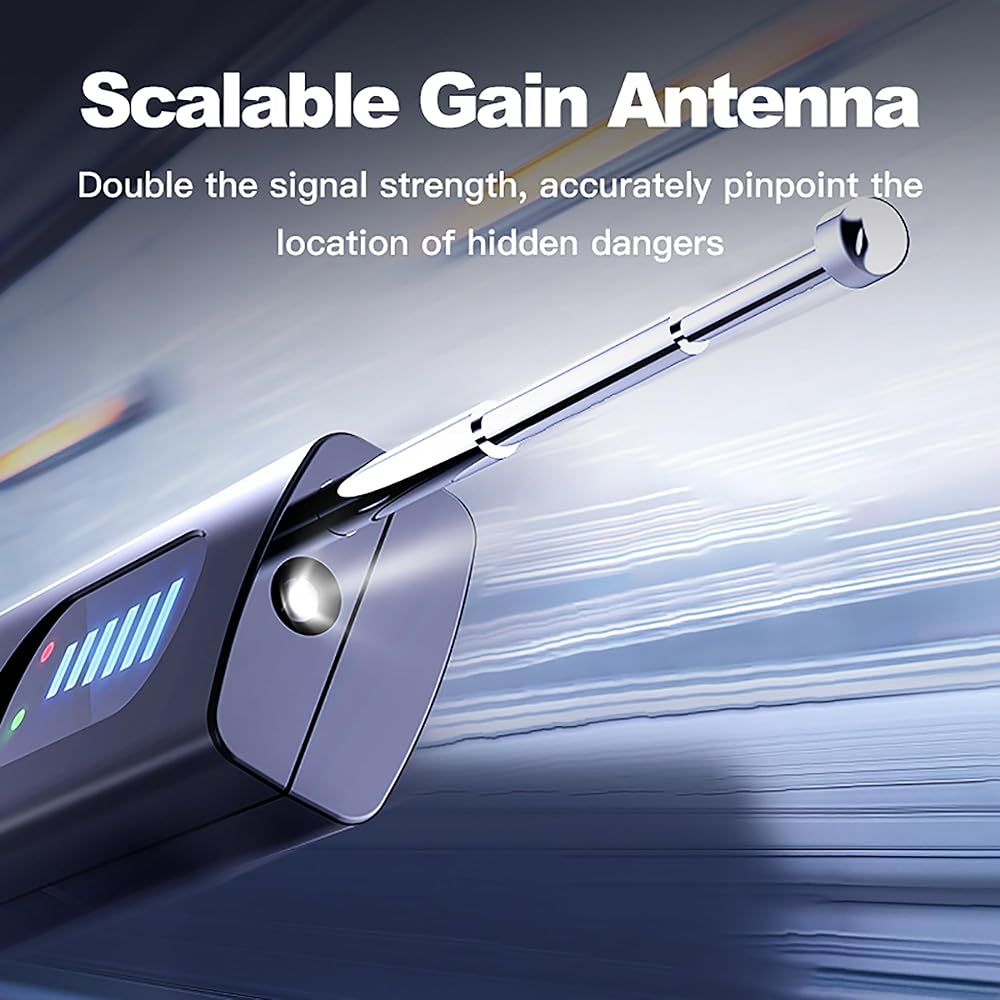 【Multi-Function Detector】1.Detect hidden cameras2.GPS magnetic field detection3.Wireless WiFi Signal Detection.4.Anti theft alarm5.Flashlight. Detects hidden cameras, spy bugs, and wireless signals with 5 adjustable sensitivity levels and 5 scanning modes.