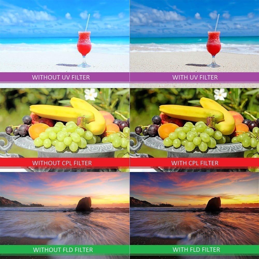 UV Filter The ultraviolet (UV) filter prevents UV light from reaching the lens, helping increase clarity and reduce haze. As a result, your photos look crystal clear even in mountainous and coastal areas, where ultraviolet light is particularly strong. CPL Filter The circular polarizer filter (CPL), meanwhile, is essential for outdoor photography, as it deepens the intensity of blue skies and reduces or eliminates glare. (Note that the circular polarizer is designed expressly for autofocus cameras.) Polarizers provide color and contrast enhancement. Reflected light often shows up as whitish glare that washes out color in an image. A Polarizer corrects this problem producing deep, dramatically blue skies. It also removes glare from non-metallic surfaces, such as windows and water. Color saturation in general, especially outdoors, can be improved significantly. Think of it as sunglasses for your camera. FLD Filter Finally, the kit offers an FLD filter which helps balance light in outdoor situations. FLD Filter provides correct color, removing harsh green cast caused by fluorescent bulbs. The FL-D and can help create pleasing skin tones under fluorescent lighting without a flash and true-to-life color rendition, along with being an essential tool in any environment where the ambient light is fluorescent.