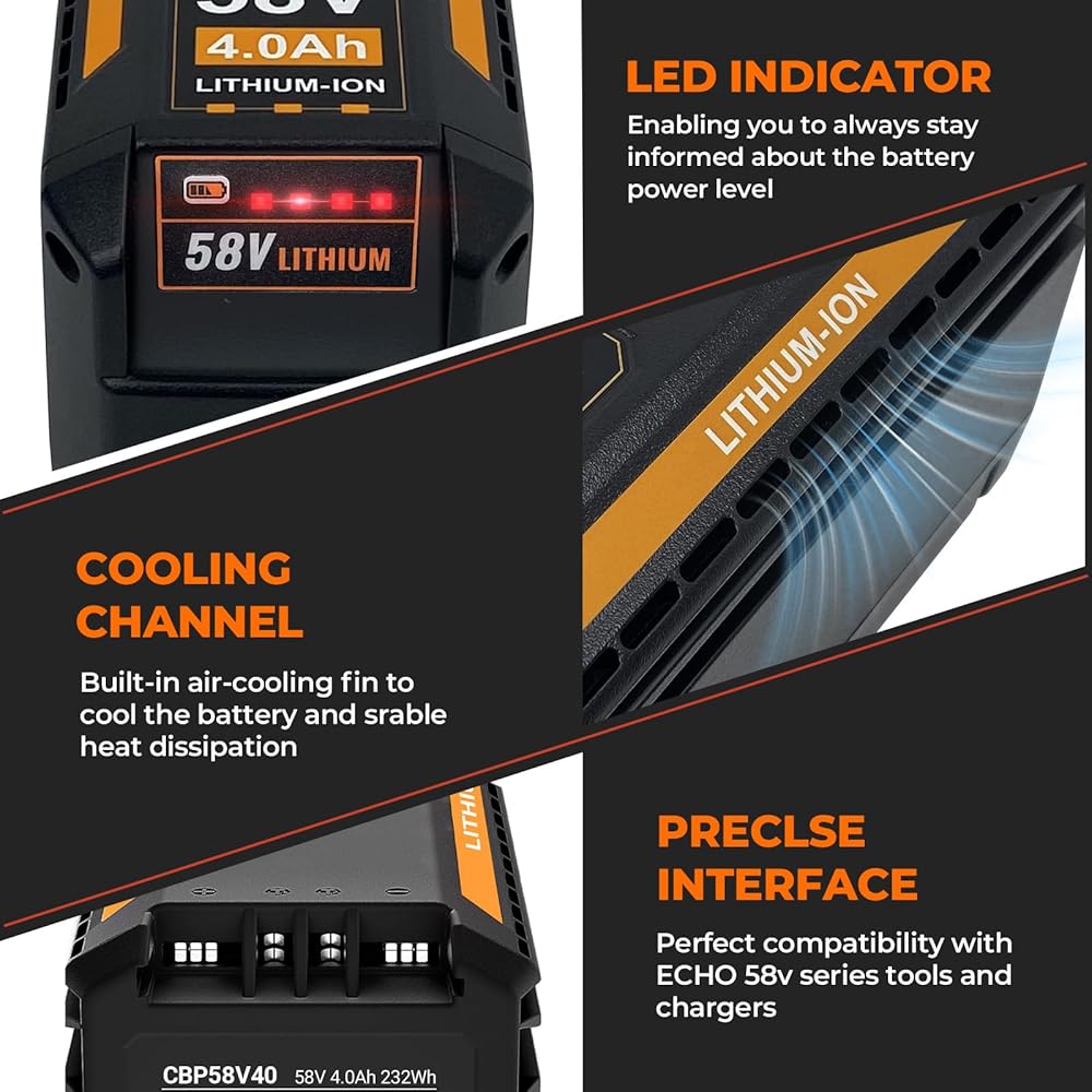 ①. Battery Type: 18650 lithium ion power batteries, Voltage: 58V, Capacity: 4.0Ah, Real High-Label. Wattage at 232Wh, great alternative battery for Echo 58V Battery CBP-58V20 CBP-58V40. Next-gen battery with breakthrough tech—superior performance and compatible with Echo/AEG.