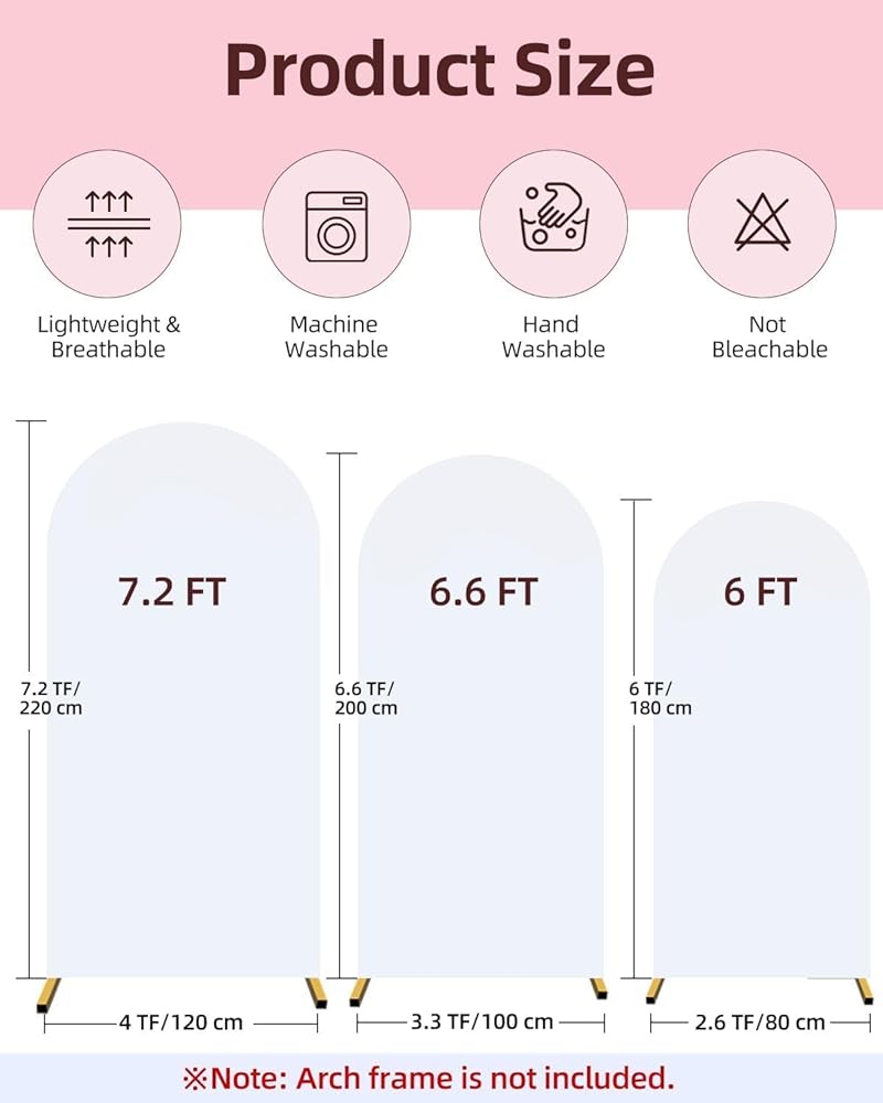 SET INCLUDES: 3 white arch covers in varying sizes - 7.2 x 4ft, 6.6 x 3.3ft, and 6 x 2.6ft (Height x Width), perfect for creating stunning backdrop displays