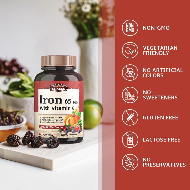 Elixeed Iron Tablets for Women & Men, 65 mg of Elemental Iron with VC, Gentle & Well-Absorbed, Blood Health, Energy Support, Vegan-Friendly, 60 Tablets, Non-GMO, No Gluten