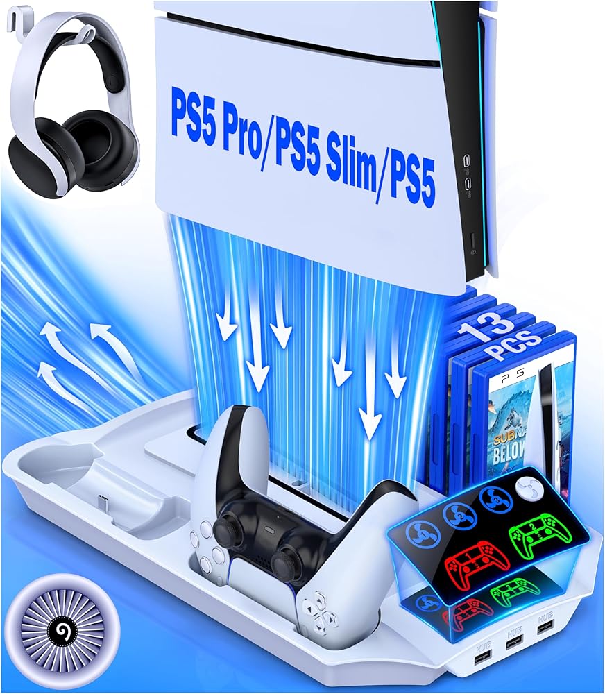 【AN IDEAL PS5 SLIM ACCESSORIES】 PS5 slim vertical stand is perfectly compatible with 2023 PS5 Slim/Dualsense controller/2020 PS5 Digital/Disc console. PS5 charging station has an extra USB port, which allows to charge other devices like mouse, keyboard, headset,phone etc.. With a sleek and tidy design, PS5 stand vertical saves much space to keep your all ps5 assecories like console, 2 controllers, 15 game discs, headset organized. Your must-have PS5 organizer