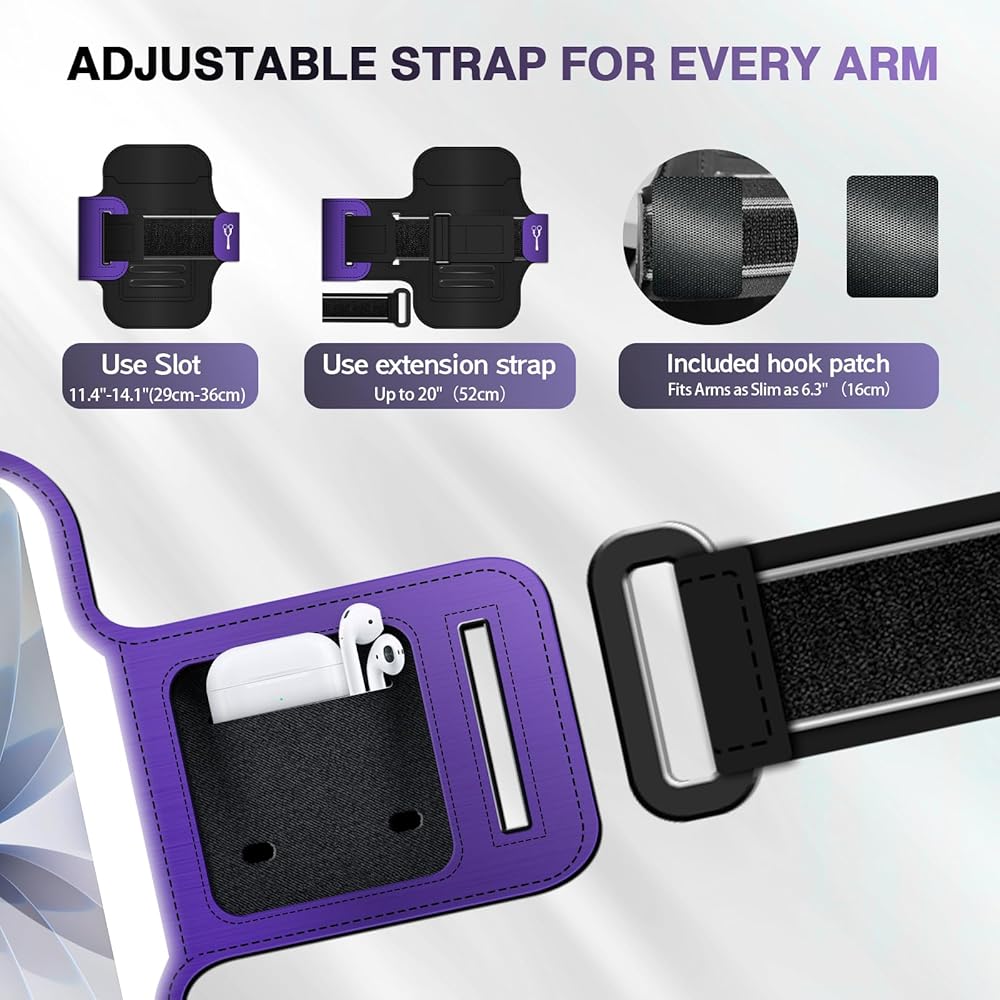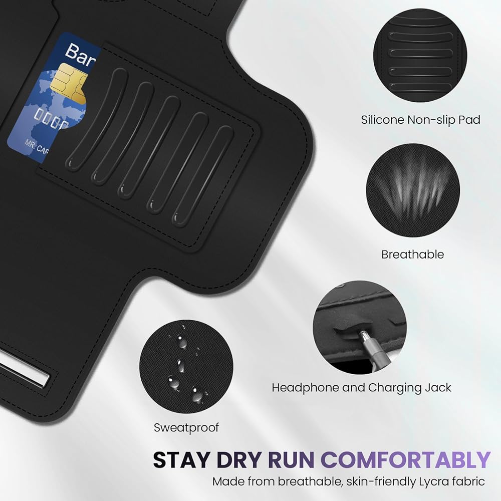 【Anti-Sweat Pro Adjustable Armband】Sweat-Wicking & Adjustable Comfort – The breathable Lycra back (skin-friendly & water-resistant) blocks sweat infiltration, while the adjustable hook-and-loop strap secures phones on arms 10.2-21.65" without slippage. Gym-ready durability meets all-day comfort.