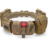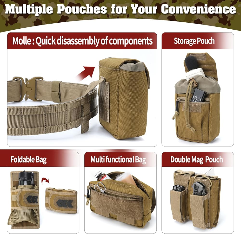 【Battlefield-Adaptive 7-in-1 System】: Tactical belt core integrates detachable MOLLE battle belt with mission-critical modules — dual rifle mag pouches (fits AR/AK mags) + EMT medical pouch + dump pouch + multi-tool carrier + general storage; 90-second reconfiguration from room clearing to wilderness extraction.