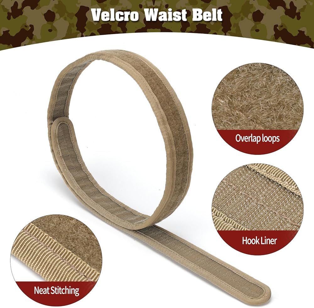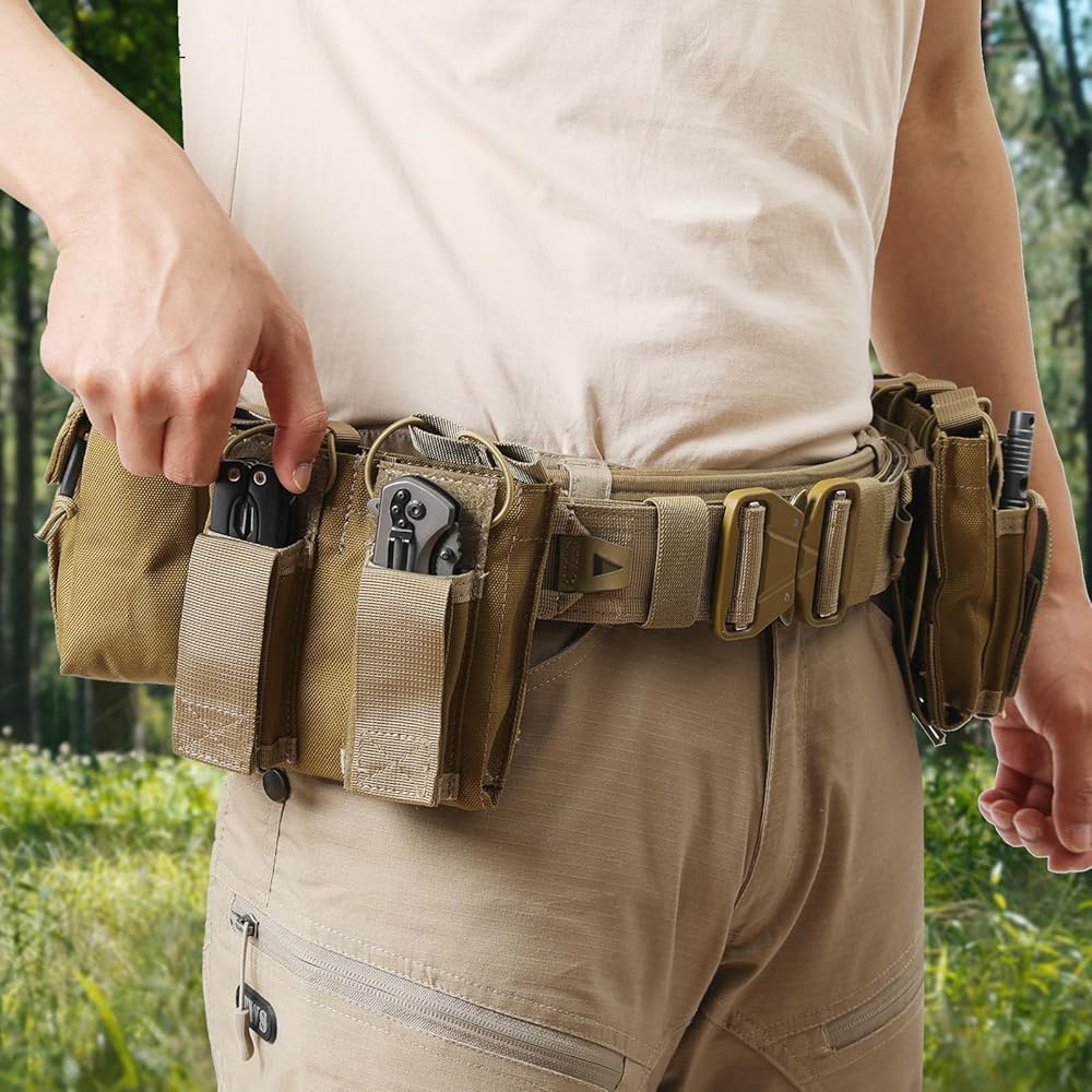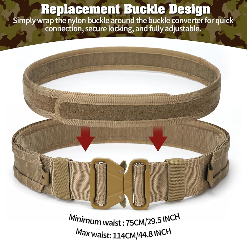 【Battle-Ready Adjustability】: Combat belt fits 29.5-44.8 inch waists (75-114cm) accommodating S-XXL tactical vest sizes, dual-layer hook-and-loop secures 50+ lbs gear load (equivalent to 4 rifle mag pouches + med kit + sidearm holster), detachable MOLLE battle belt converts to standalone duty rig for police patrol or transitions to hunting setup with game skinning knife sheath.