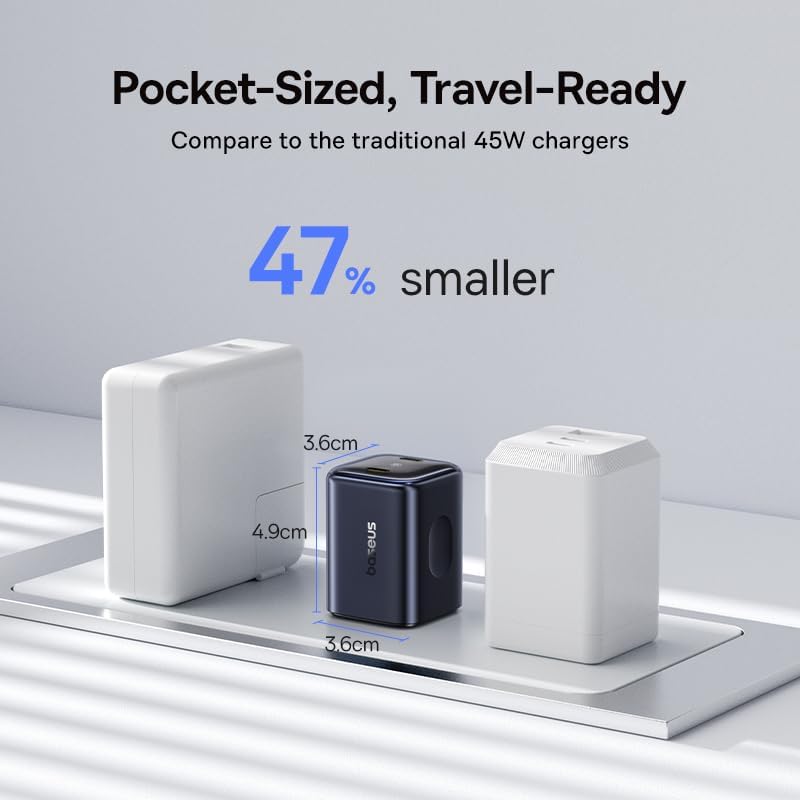 Smaller Size, Greater Portability: Baseus 67W usb c charger adopting high-density integrated design, this fast charger is 60% smaller than traditional 67W chargers, making it easily fit into pockets or carry-on bags. And it won't block or interrupt adjacent sockets. The foldable pin saves space and will not scratch other items when stored together. It's an ideal power companion for business trips.
