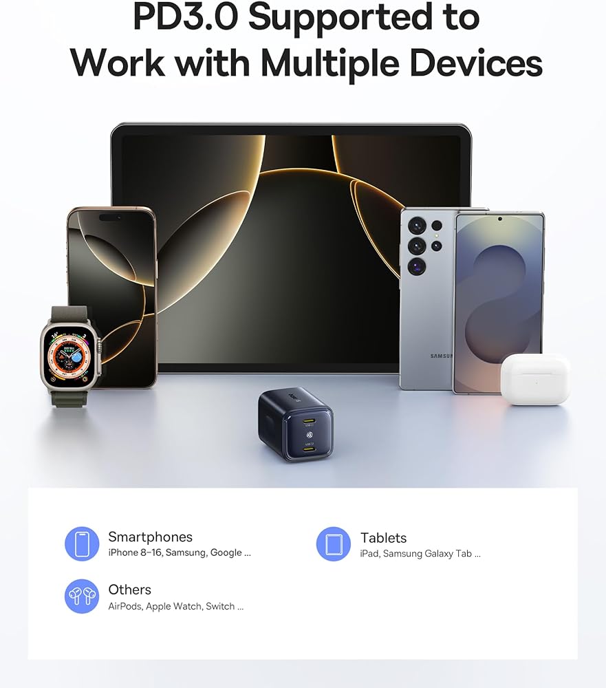 Wide Compatibility: Supports mainstream fast charging protocols including PD3.0, QC4.0, and PPS. Equipped with two USB-C ports, this fast charger is compatible with computers (MacBook Pro/Air, ThinkPad, Dell), phones (iPhone 16 series, Galaxy S25 series), tablets like the iPad Pro, and other devices such as Switch and AirPods. It can adjust and allow power based on the connected device, whether it's an old or a new model.