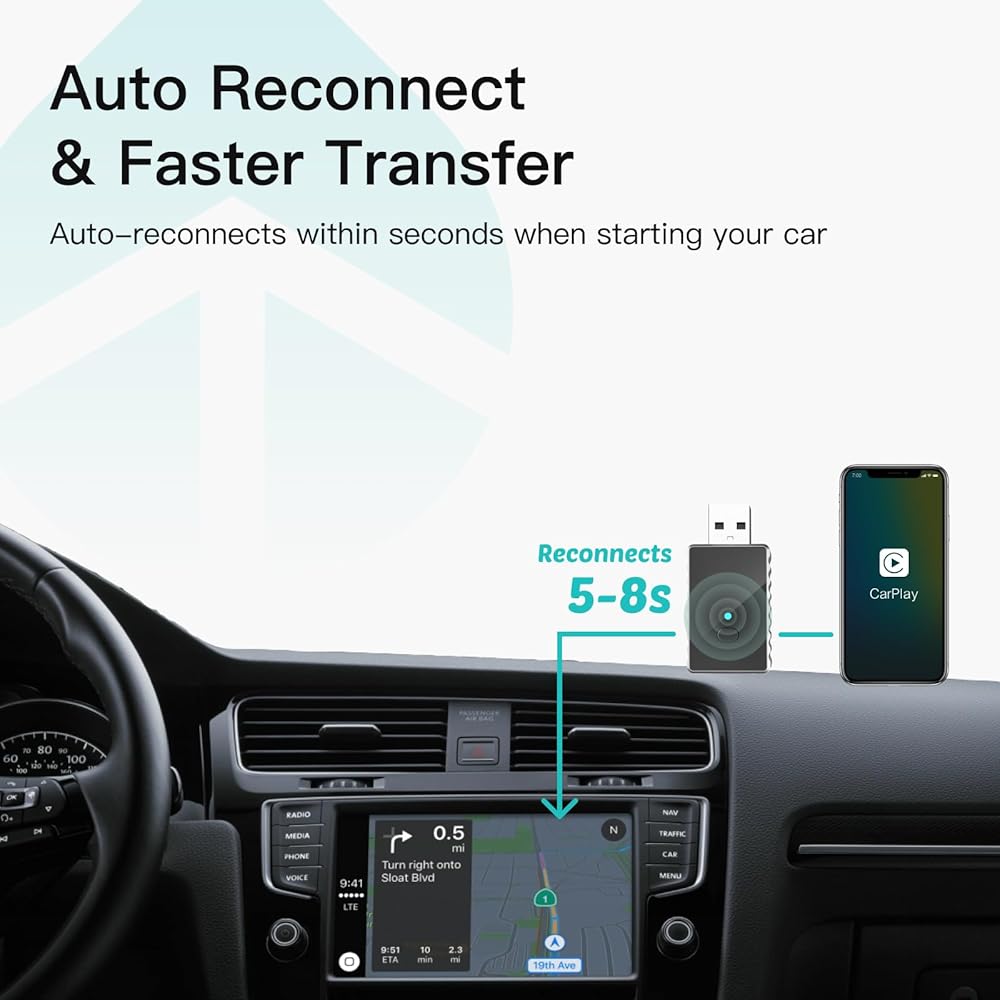 AUTO RECONNECT & FASTER TRANSFER:Auto-reconnects within seconds when starting your car. Utilizing high-speed data transfer tech, it's 3X faster transmission speed than standard adapters. Dual-band signal for zero lag, ensuring smooth navigation, music, and calls even on rough roads