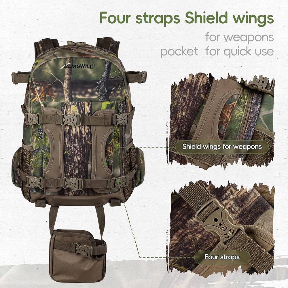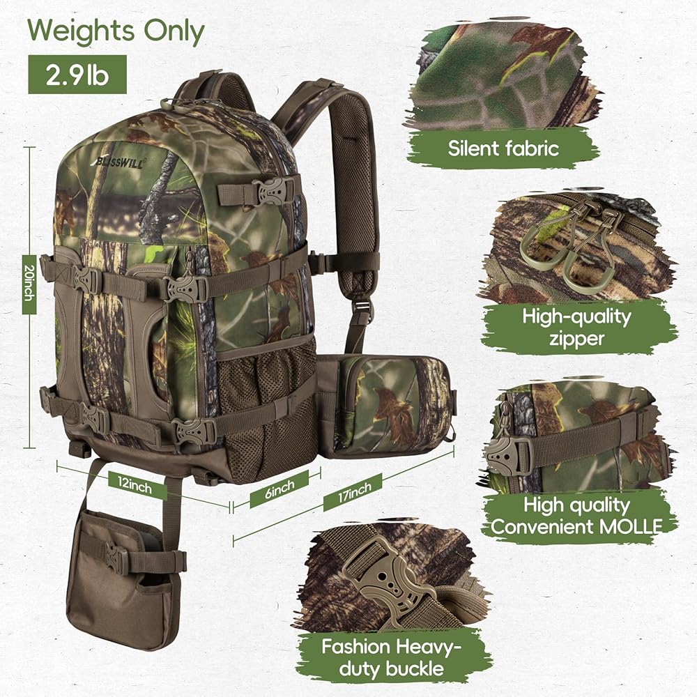 Lightweight&Comfortable:Padded shoulder straps and a ventilated mesh back panel effectively reduce fatigue, while the adjustable chest strap/waist belt evenly distributes weight. The height-adjustable chest strap makes it an ideal choice for long treks, camping, or big-game hunting
