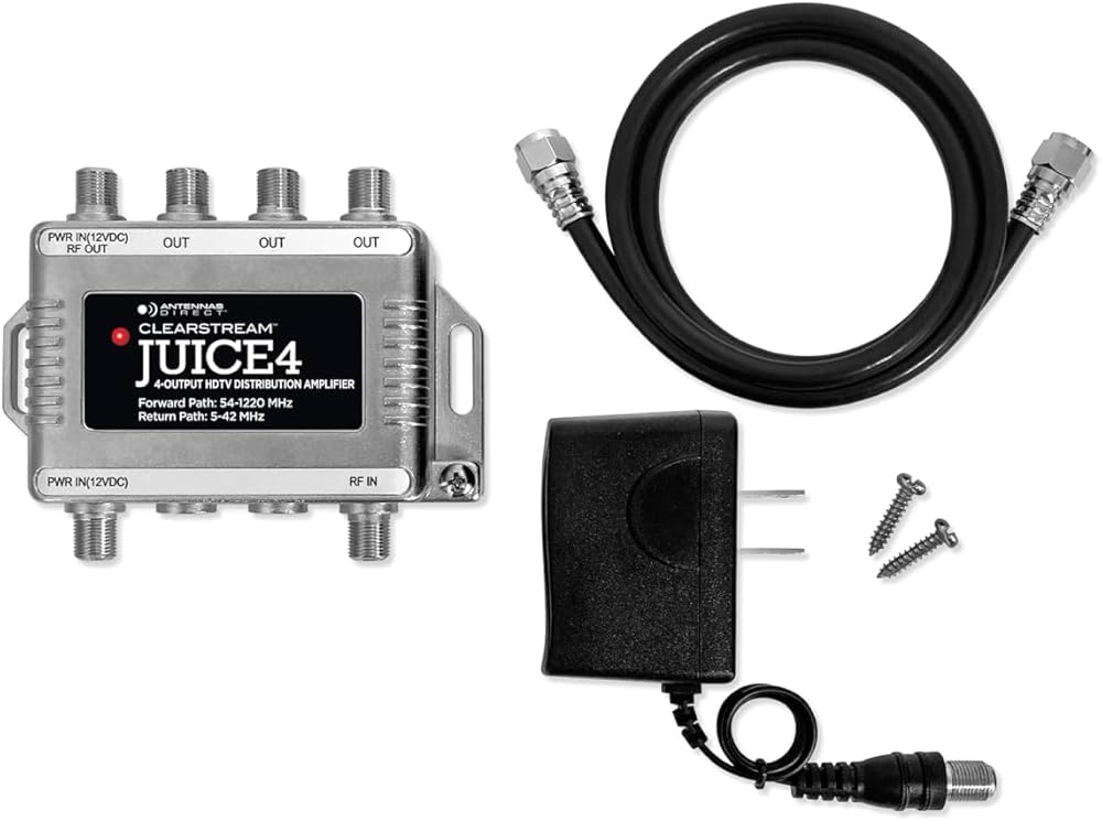 The Antennas Direct ClearStream JUICE4 amplifier boosts the TV signal from your indoor or outdoor TV antenna or CATV system and distributes that signal to as many as four TVs. Distributing signal to multiple TVs and using 50 ft. or more of coaxial cable can result in some signal loss. The JUICE4 helps overcome these signal challenges by strengthening the signal coming in from the TV antenna's coaxial cable for clear, consistent reception and picture quality. This 4-output distribution amplifier is designed to be used in homes and professional settings in urban, suburban, and rural areas. Operating frequency extends to 1.2 GHz to accommodate CATV and cable broadband applications. Precision machine-sealed zinc diecast housing protects against dust and water droplets and provides shielding from electrostatic discharge, with excellent surge protection on all ports. Can be used outdoors with 75 Ohm F-termination caps, coaxial cables that have watertight F-connectors, and a power inserter (not included) to allow the power adapter to share the coaxial cable connected to the designated output shown on this device. Details: Dimensions: 3.5" H x 3.8" W x 1" D; Weight: 8.8 oz.; Compatibility: Indoor / outdoor, HDTV, analog, digital antenna installations, legacy CATV systems; Frequency Range: Forward Path 54-1220 MHz, Return Path 5 - 42 MHz; Low Noise Figure: