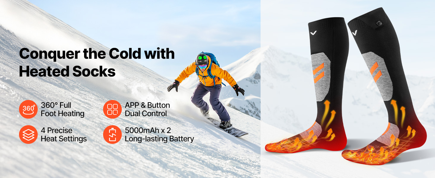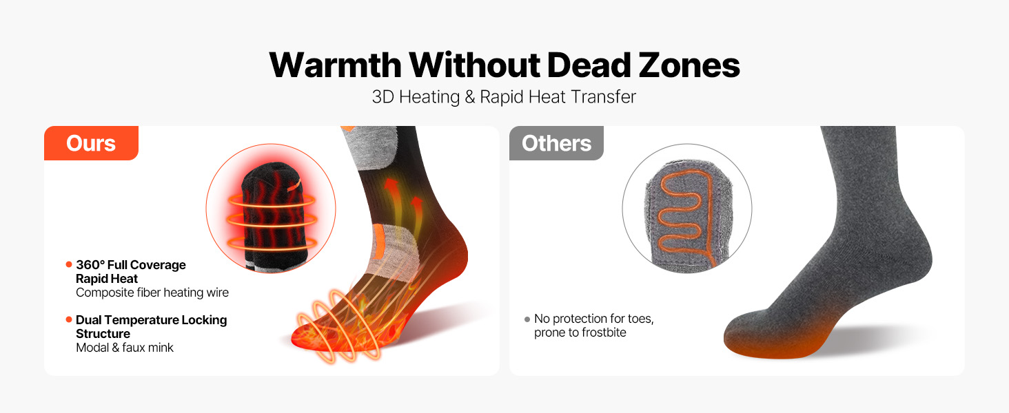 • 360° Heating: Our heat wire of the electric heated socks envelops your toes, soles, and feet tops, delivering even warmth to keep you toasty in cold conditions. Ideal for outdoor workers and winter sports lovers, providing warmth where you need it most