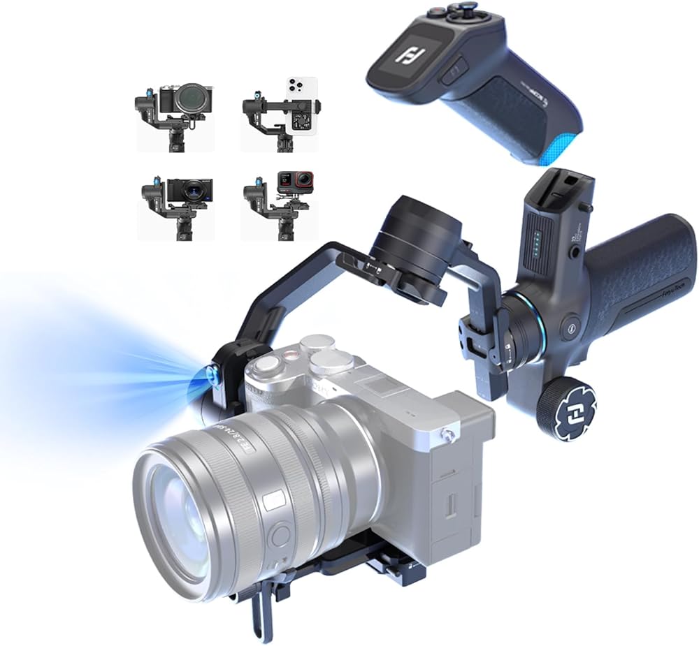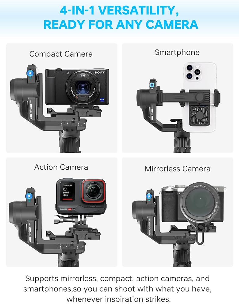 [One Gimbal, All Your Gear] SCORP Mini-3 Pro camera gimbal with tracking and phone control. Securely holds your smartphone, action cam, compact camera, or mirrorless/DSLR (up to 4.41 lbs). It's the ultimate all-in-one stabilizer.