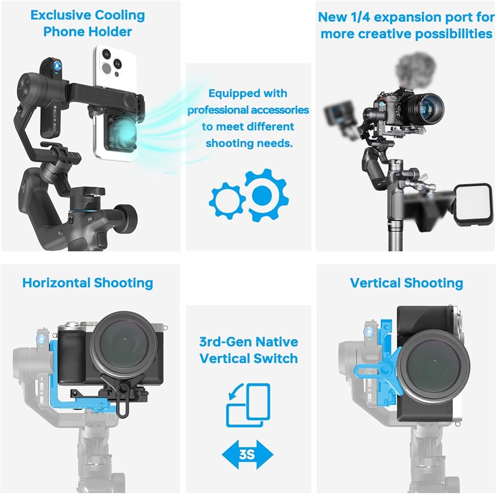 [Built-in Phone Cooling, Seamless Switch] Feiyu SCORP Mini 3 Pro comes with a heat-dissipating phone clamp and upgraded Quick Release System 3.0, allowing seamless horizontal or vertical transitions and easy device swaps on the go.