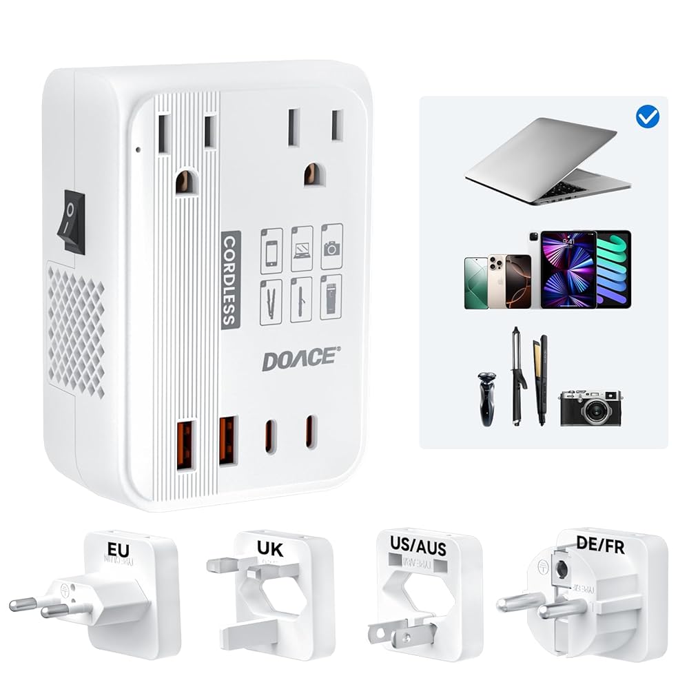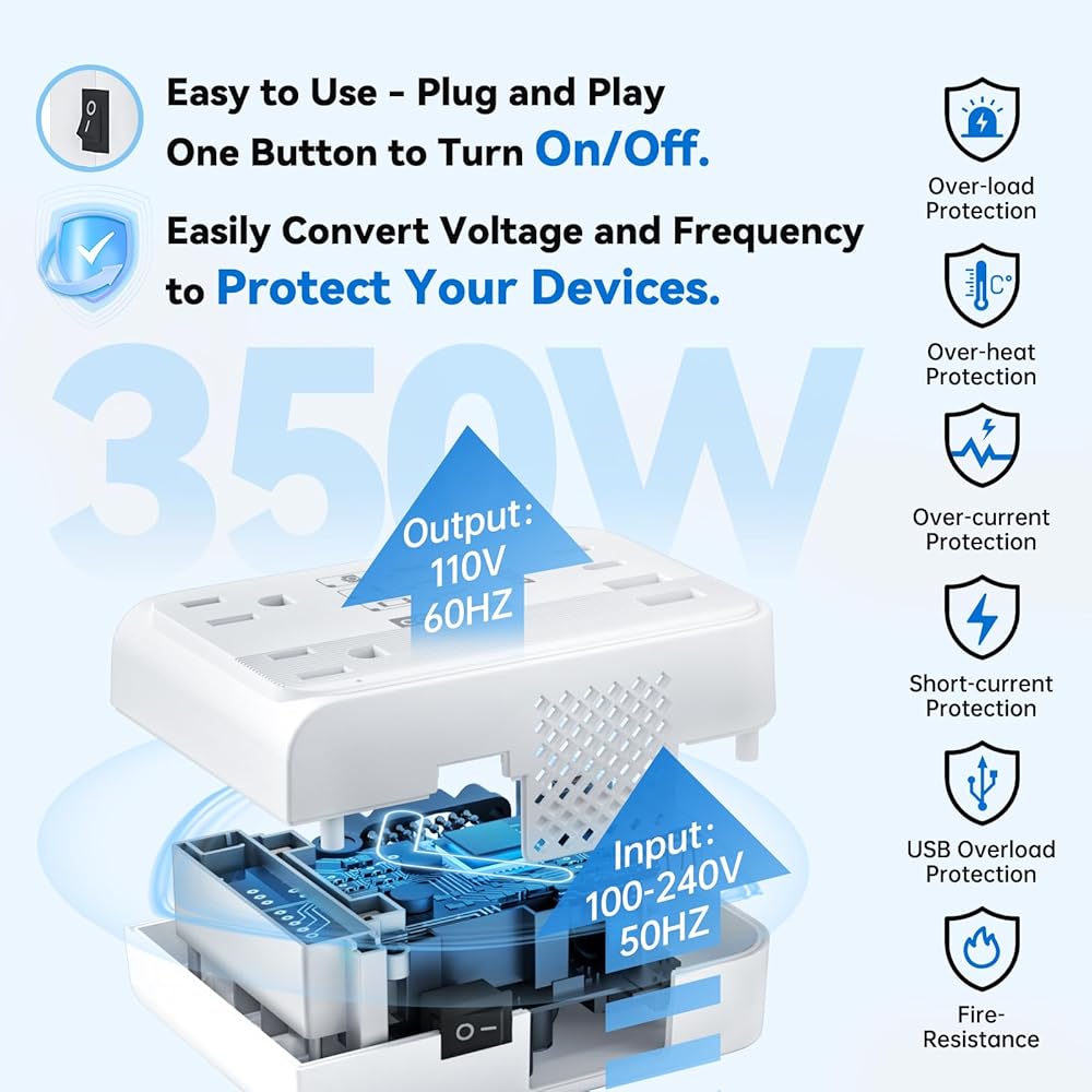 Safe to Use: The DOACE converter offers robust protection against under-voltage, over-voltage, overheating, overload, over-current, and short circuits. When the socket indicator is red and green, it indicates that the total power of the appliance exceeds 350W. Please reduce the device in use and press the power button again. When the indicator is green, the power converter can work normally.