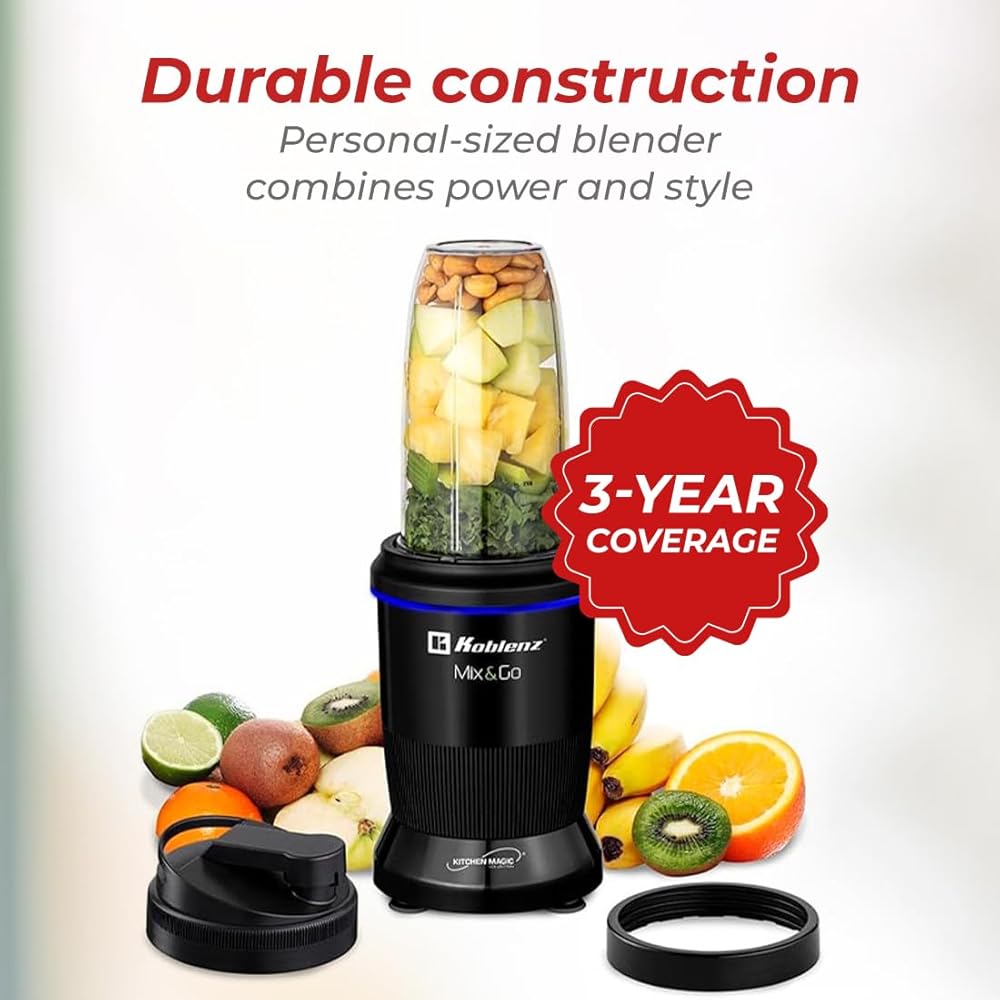 Blend smarter and faster with the Koblenz Mix&Shake Blender—a true essential for your home and kitchen. The powerful 600-watt motor crushes fruits, veggies, and ice with ease, helping you create delicious smoothies, shakes, and sauces at the touch of a button. Built for durability, the metal copple ensures lasting performance, making this personal blender a reliable kitchen companion. The stainless steel blades are designed for maximum precision, giving your smoothies and frozen drinks that perfectly silky texture you crave. Thanks to the easy-to-use On/Off button and versatile Pulse function, you can switch between consistent blending and controlled bursts of speed, giving you full control over your recipes. The 20 oz to-go bottle is the ideal size for single-serve smoothies. Whether you're refreshing your home & kitchen setup, the Koblenz Mix&Shake stands out among blenders for kitchen needs, delivering efficiency every time. The black, blue, and green color options include (1) 20 oz to-go bottle, while the pink color blender comes with (1) 20 oz to-go bottle, (2) 10 oz glass jars.