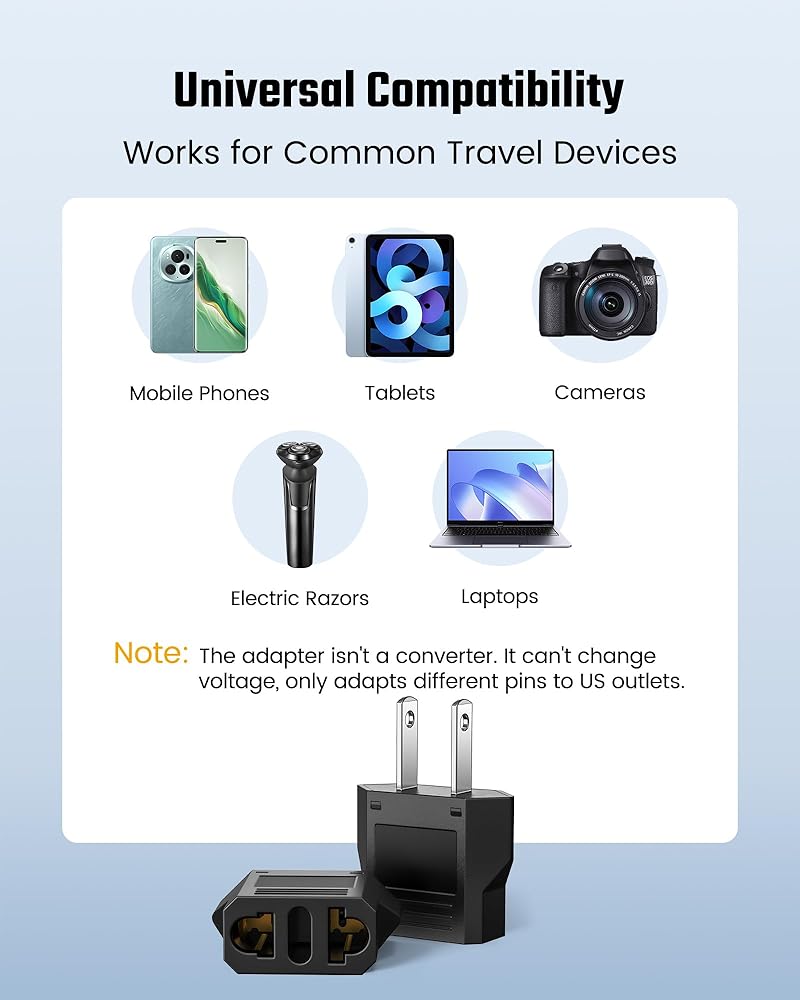 【Note】 This adapter does not convert voltage. It only adapts the plug type. Make sure your devices support US voltage (120V) and frequency (60Hz) before traveling
