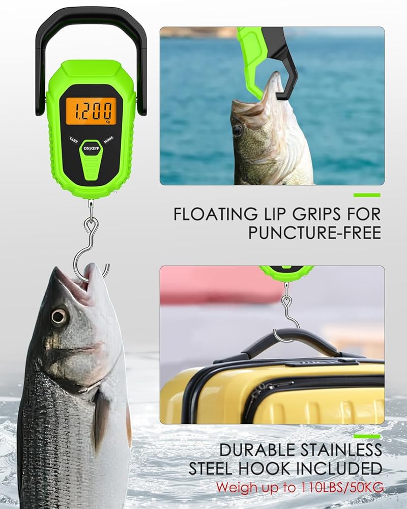 Fish Scale with Lip Gripper – 110lb/50kg Digital Fishing Weight Scale with Hook & Clamp, LCD Display & Hanging Design – Ideal Boat Gift for Anglers & Men