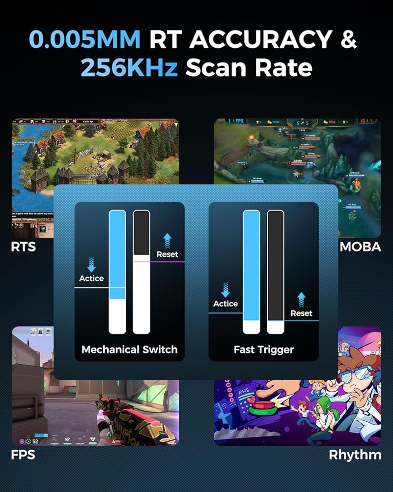 Hall Effect Magnetic Switches for Precision Control -- Advanced Hall Effect technology provides lightning-fast 0.005mm sensitivity and adjustable actuation points (0.1–3.6mm), giving you full control over every keystroke.