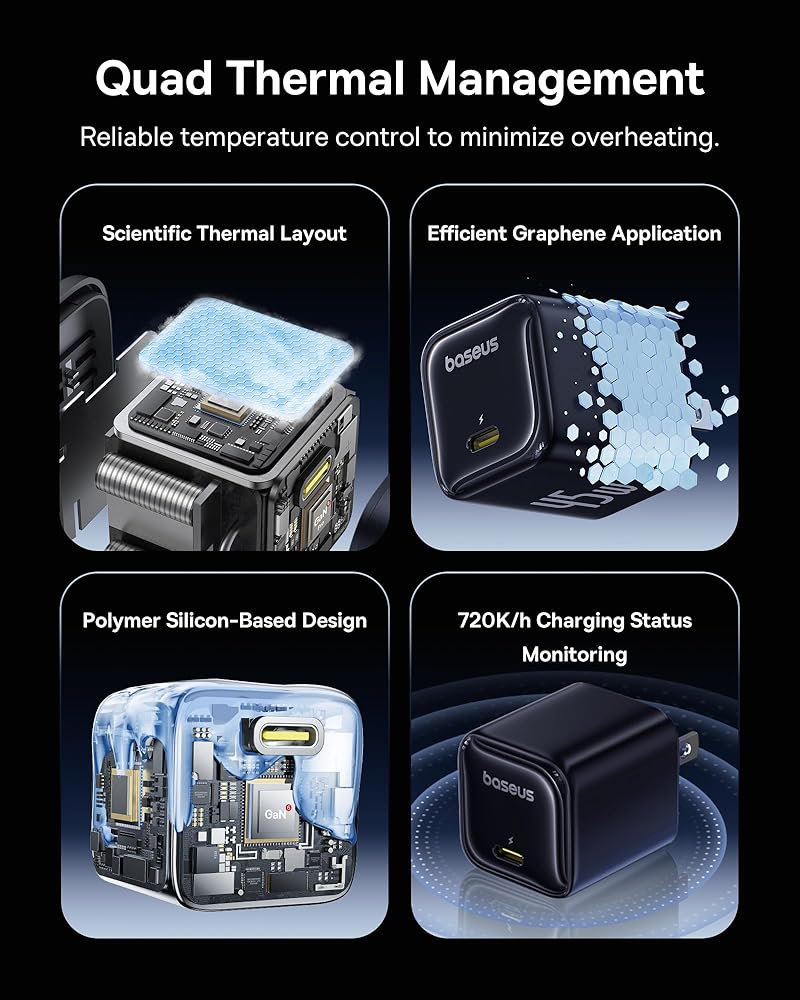 Powered by GaN Tech: Powered by GaN chip technology, this 65W USB-C charger boasts an impressive 92% energy conversion rate to redefine your ultimate safe, fast charging experience with higher efficiency, lower temperature, and smaller size.