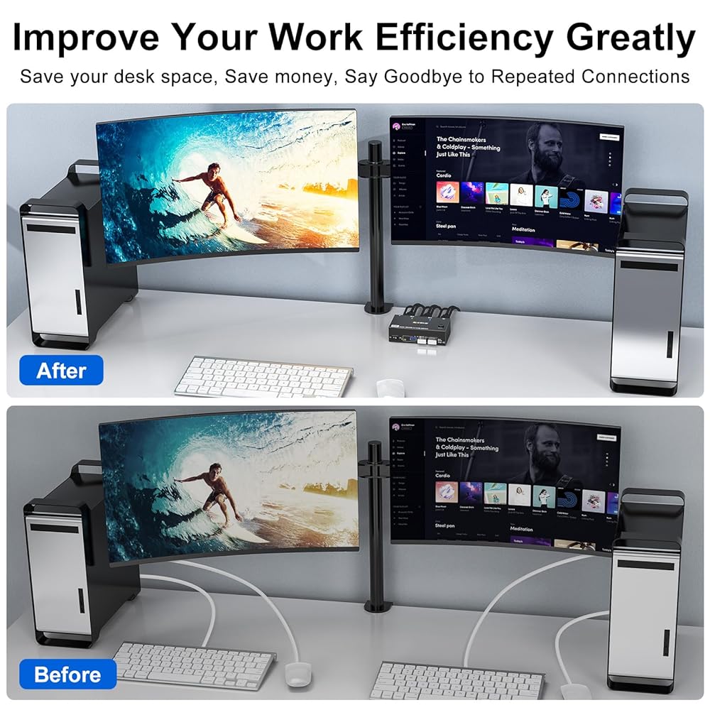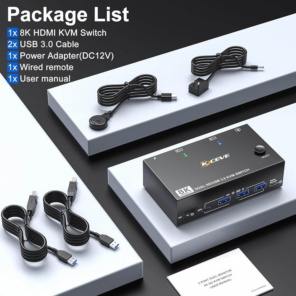 Power Adapter and ON-OFF Switch Designed】The two computers two monitors switch is powered by USB cables, and the upgraded 12V power adapter makes the 8K dual monitors KVM switch work smoother and provides more stable recognition when connecting high-power USB devices. When not in use, just turn off the KVM without unplugging the cables.