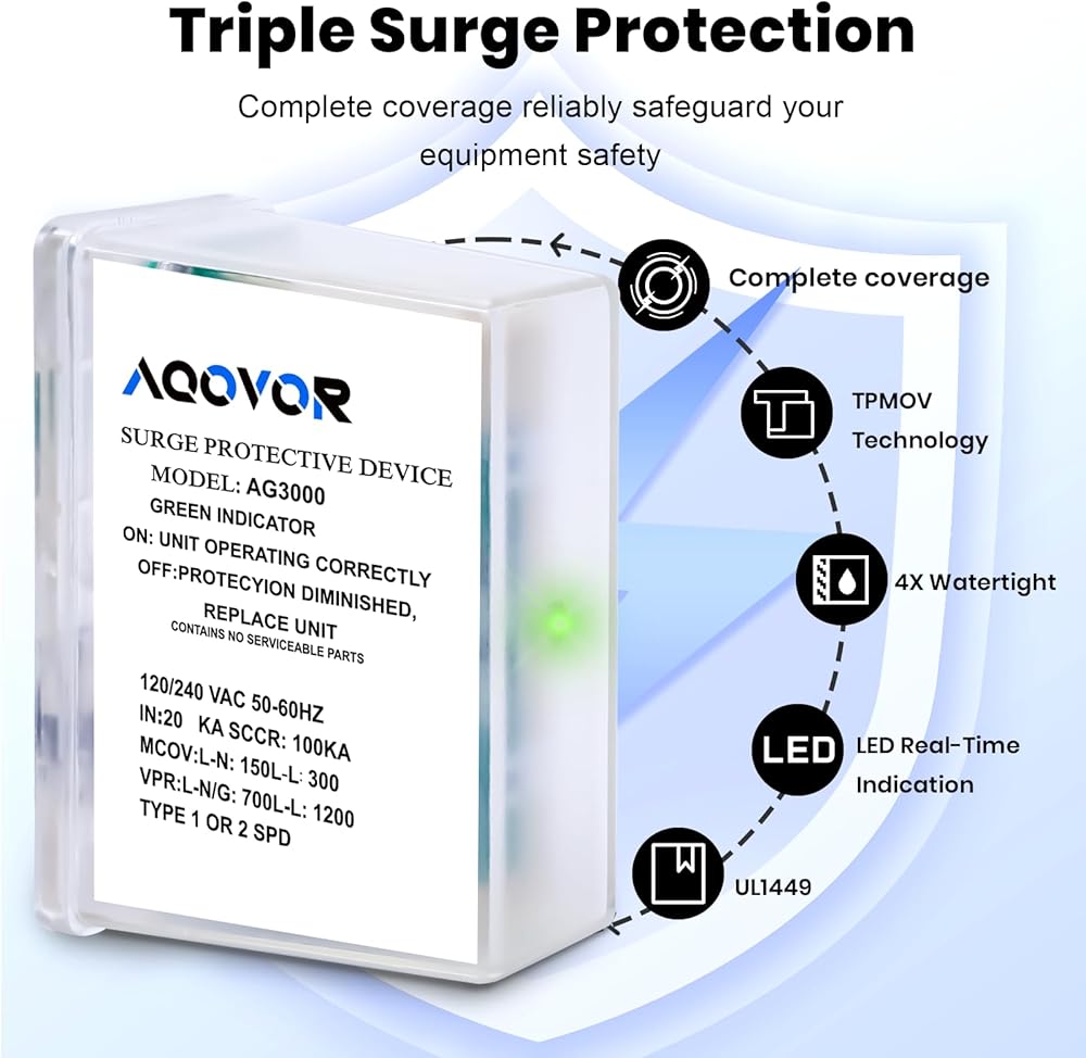 【Comprehensive HVAC Surge Protector】AG3000 HVAC Surge Protector Shield HVAC systems and appliances from power surges with 360° coverage across all line configurations Line-to-Ground (L-G), Line-to-Line (L-L), and Line-to-Neutral (L-N)—to block destructive voltage spikes and prevent costly equipment damage