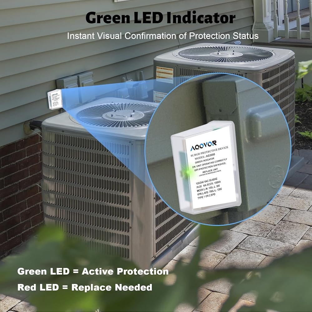 【Real-time status monitoring】The AG3000 built-in green LED light allows you to instantly confirm the overvoltage protection status—a lit light indicates that the HVAC surge protector is actively guarding equipment, while a dark light indicates that replacement is needed. This intuitive visual cue eliminates guesswork, ensuring HVAC systems and appliances remain safeguarded without blind spots in maintenance