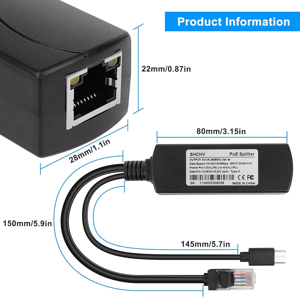 TYPEC0503G PoE splitter,a new model: With RJ45 port and an port with TYPEC/USB-C. it is an economical and practical PoE remote power equipment base on IEEE802.3af /at standard. It can separate the power and data via cable transmission.Proper matching use with poe switch or PSE injector which meet standard IEEE802.3af/at,Provides power and data at the same time for the terminal device does not support PoE. PoE splitter, output voltage of 5V use with the power supply equipment, It helps to expand wireless city, Security monitoring and other poe practical place, and is not restricted by layout of power line