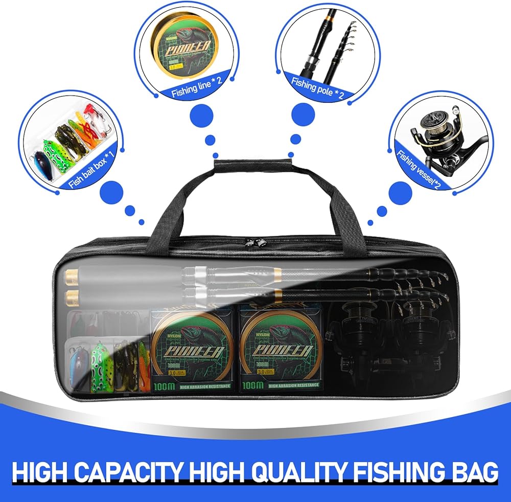 Complete Fishing Kit for All Levels: Includes 2x 6.9ft Carbon Fiber Rods, 2x 3000 Spinning Reels, 2x 3# Fishing Line Spools (100m each), 1x Tackle Box (40+ Lures & Hooks), and 1x Heavy-Duty Carrier Bag