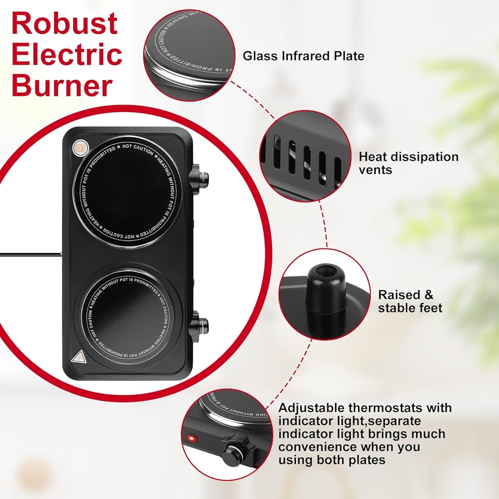 【Heating Quickly & Evenly】 Adopted with special infrared technology and equipped with 2000W Φ7.5in glass heating plate and 800W Φ6.3in glass heating plate, the Infrared Dual Burner heats up quickly and cooks food evenly without any hot or cold spots. Dual hot plates allow you to cook two dishes at the same time, saving you more time.