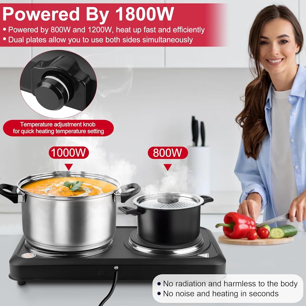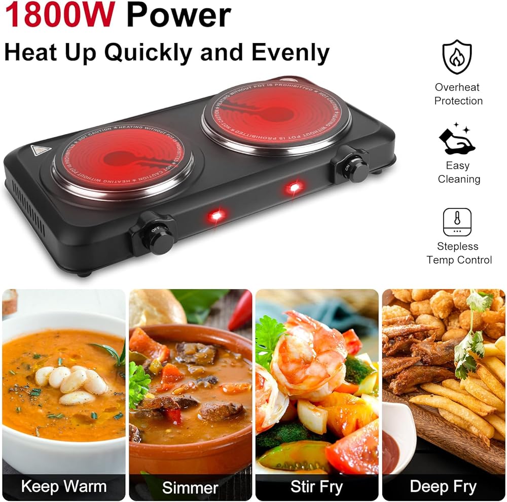 1800W Hot Plate,Portable Electric Stove Countertop Double Burner Infrared Burner with 7.5" & 6.3" Ceramic Glass Cooktop Stepless Temperature Adjustments for Home