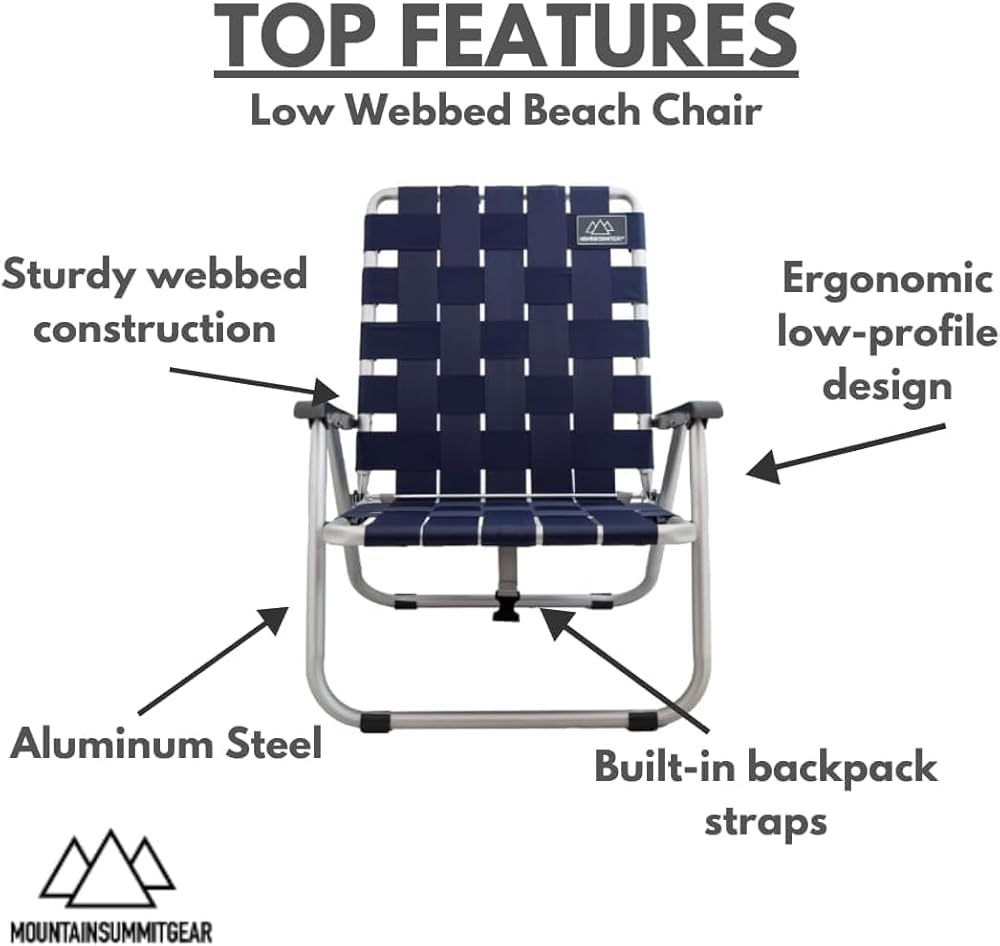 Ergonomic low-profile design ideal for lounging near the sand, surf, or tide, offering a relaxed beach seating experience perfect for sunbathing or reading by the ocean.