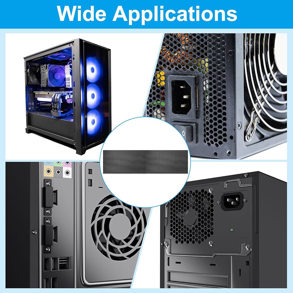 The PC fan dust filter helps keep your PC clean, protect the PC from overheating, reduce fan noise, and extend the fan lifespan. Suitable for PC cooler fans, home computer chassis fans, speaker grilles, and various electronics for dust protection.