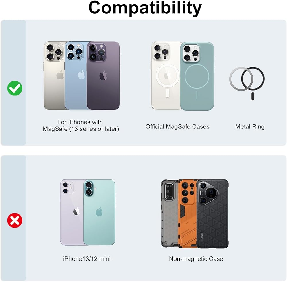 【Compatible with MagSafe】: Designed for MagSafe ; For iPhone 16/15/14/13 series, not for iPhone 13/12 mini
