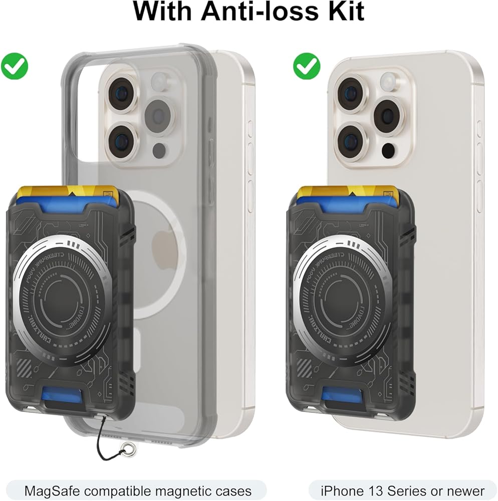 【with Safety Set】: Built with N52 magnets for a magnetic grip even stronger than the official Mag Safe wallet. In addition, it comes with a safety rope and T-shaped clip that can be built into the phone case and phone, providing extra security for your card. Rest assured—your wallet stays firmly in place, with no slips or drops